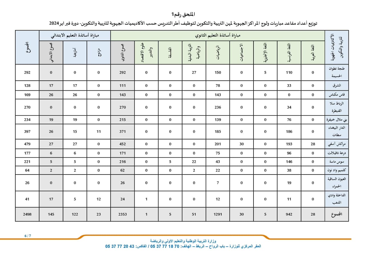 وهكذا، أعلنت الوزارة عن إجراء مباريات "استثنائية" لولوج المراكز الجهوية لمهن التربية والتكوين للتوظيف في الدرجة الثانية من أطر التدريس– دورة فبراير 2024، خصصت لها 2498 مقعدا، منها 1291 للرياضيات و 942 للفرنسية.