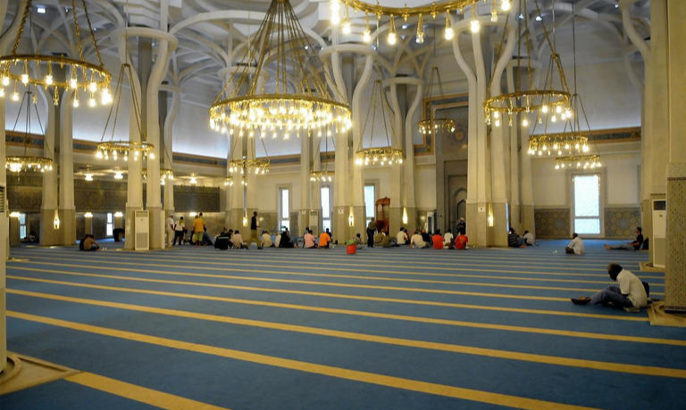 ويمتد المسجد على مساحة تناهز 30 ألف متر مربع، ويتوسطه مئذنة يتجاوز ارتفاعها الأربعين مترا، تعلوها أهلة فضية، ويحيط به فضاء أخضر شاسع. وقد شيد باستخدام مواد إيطالية صرفة، من ضمنها حجر الترافرتين والطوب الوردي الفاتح.