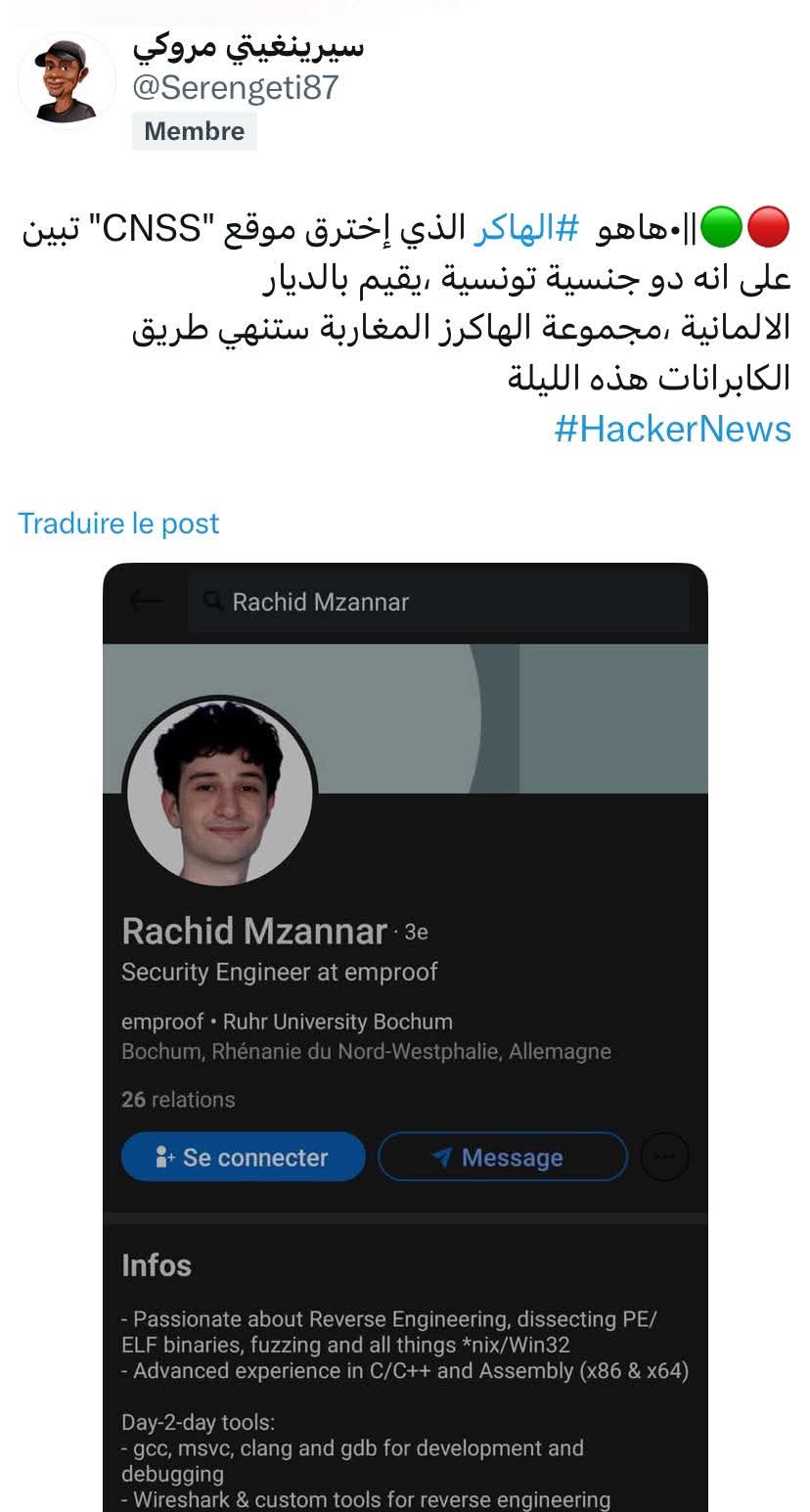 أفادت مصادر من مجتمع الهاكرز المغربي بأنهم تمكنوا من تحديد هوية الشخص المسؤول عن اختراق المنصات الإلكترونية المغربية مؤخراً. ووفقاً لهذه المصادر، فإن المخترق تونسي الجنسية، يقيم ويدرس في ألمانيا.