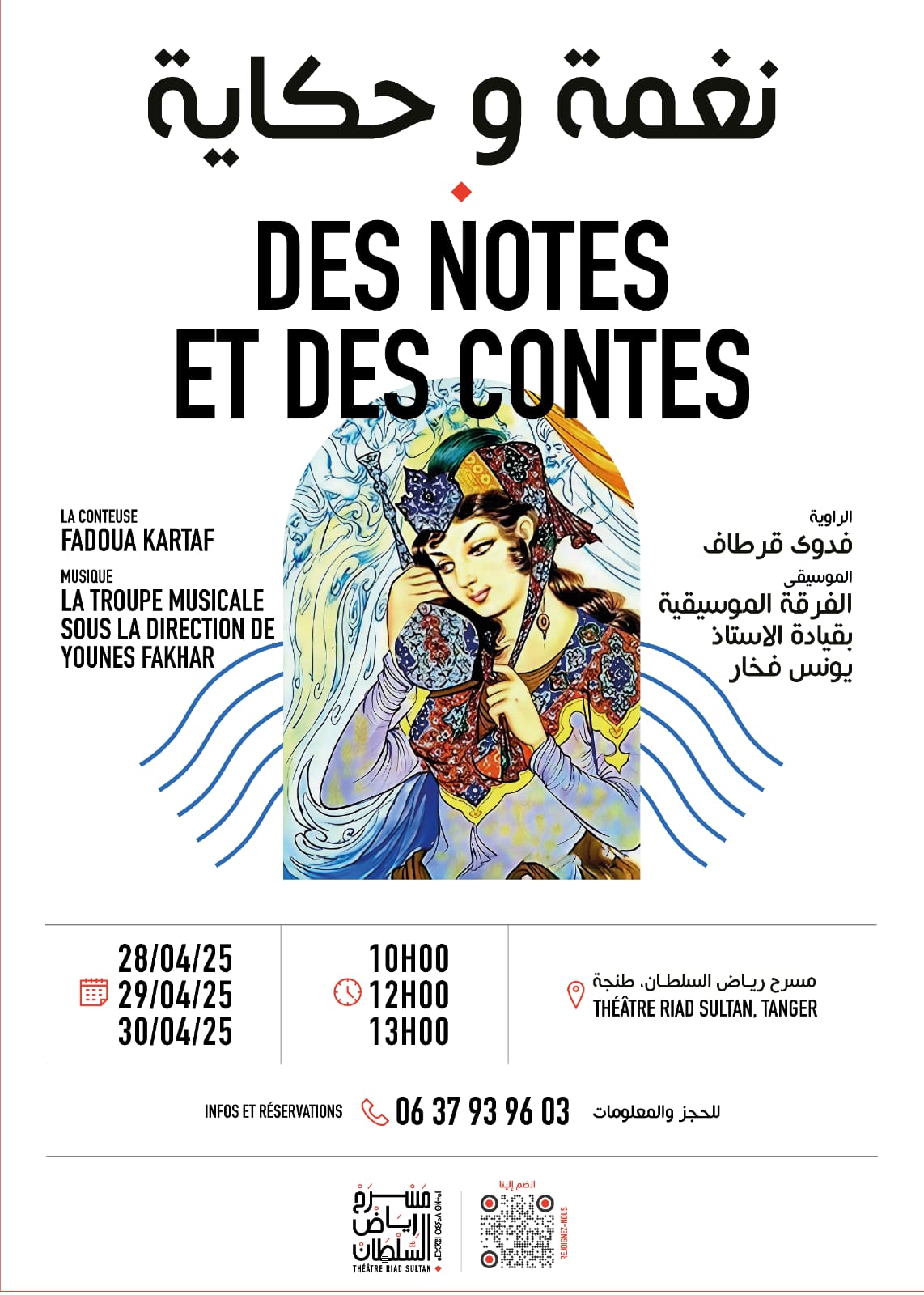 ومع ختام الشهر، يقدم مسرح رياض السلطان عرض "نغمة وحكاية"، وهو عرض خاص بالجمهور الناشئ، أيام الاثنين 28، الثلاثاء29 والأربعاء 30 أبريل، تشخصه فدوى قرطاف في حكي ملعوب يرافقها فيه الموسيقار يونس فخار في حوار بين الحكي والموسيقى في تجربة حالمة تجعل الأطفال ينغمسون في عالم من الخيال والإبداع.