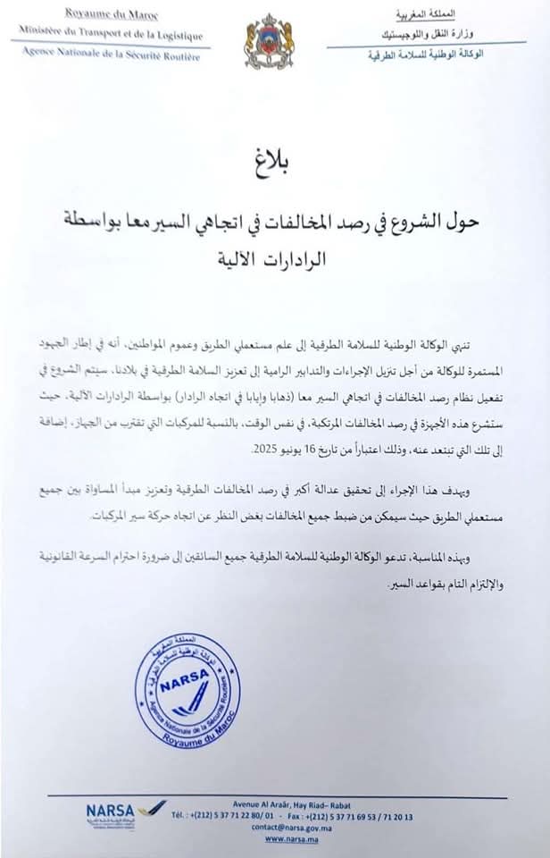 أعلنت الوكالة الوطنية للسلامة الطرقية، عن الشروع في تفعيل نظام رصد المخالفات في اتجاهي السير معا (ذهابا وإيابا في اتجاه الرادار) بواسطة الرادارات الآلية.