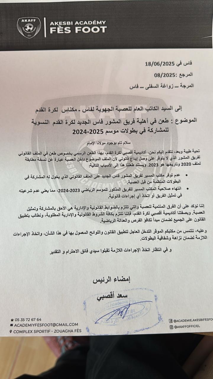 وجه رئيس أكاديمية اقصبي العصبة الجهوية لكرة القدم فاس - مكناس رسالة إلى رئيس العصبة الجهوية لكرة القدم يطعن فيها في قانونية جمعية المشور فاس الجديد التي لم تتوفر على ملف قانوني ليخول لها المشاركة في البطولة الجهوية للعصبة.