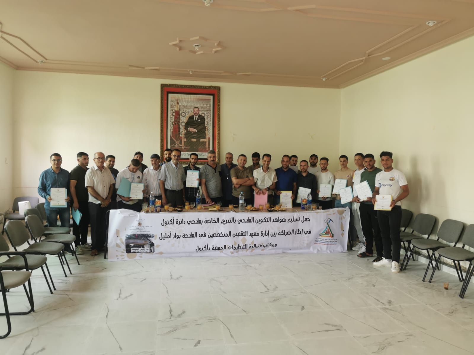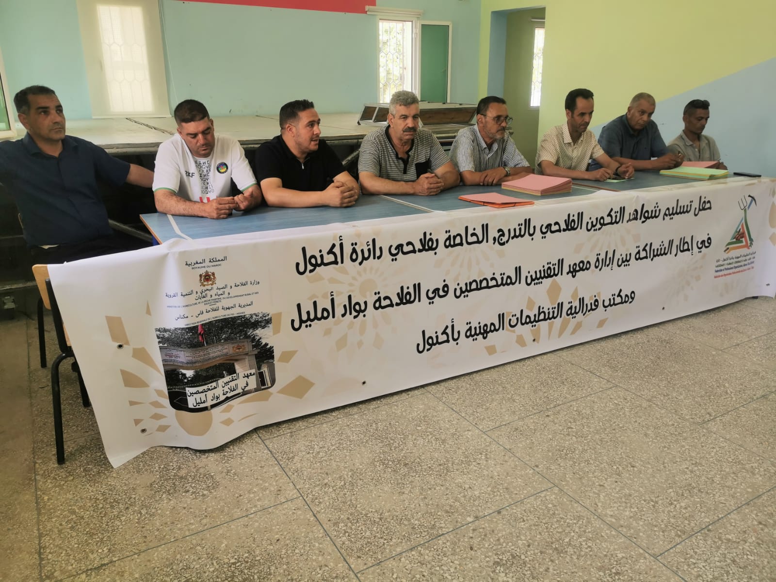 وفي الاخير ، أشرف مدير معهد التقنيين المتخصصين في الفلاحة بواد أمليل ، و رئيس فدرالية التنظيمات المهنية بدائرة أكنول ، على توزيع الشواهد على المتخرجين.