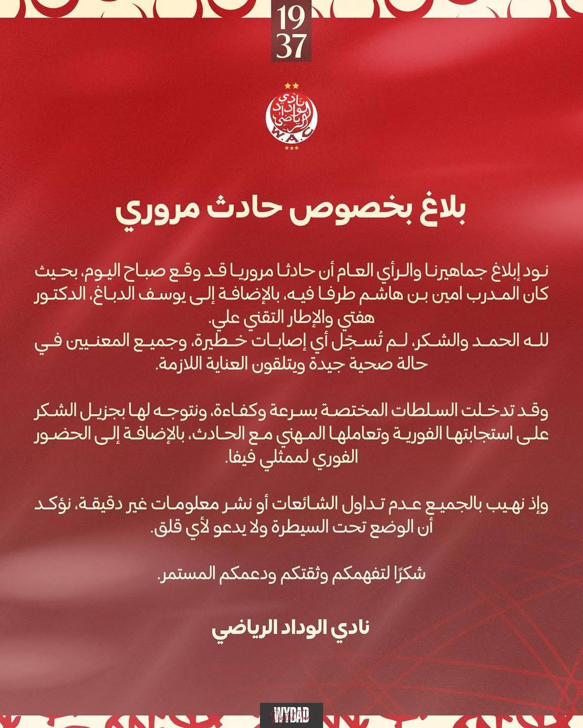وفي بيان رسمي، أكد نادي الوداد، أن "حادثا مروريا وقع صباح اليوم الإثنين بتوقيت أمريكا، كان المدرب، أمين بنهاشم طرفا فيه، بالإضافة إلى يوسف الدباغ، والدكتور عبد الرزاق هيفتي، والإطار التقني، علي".