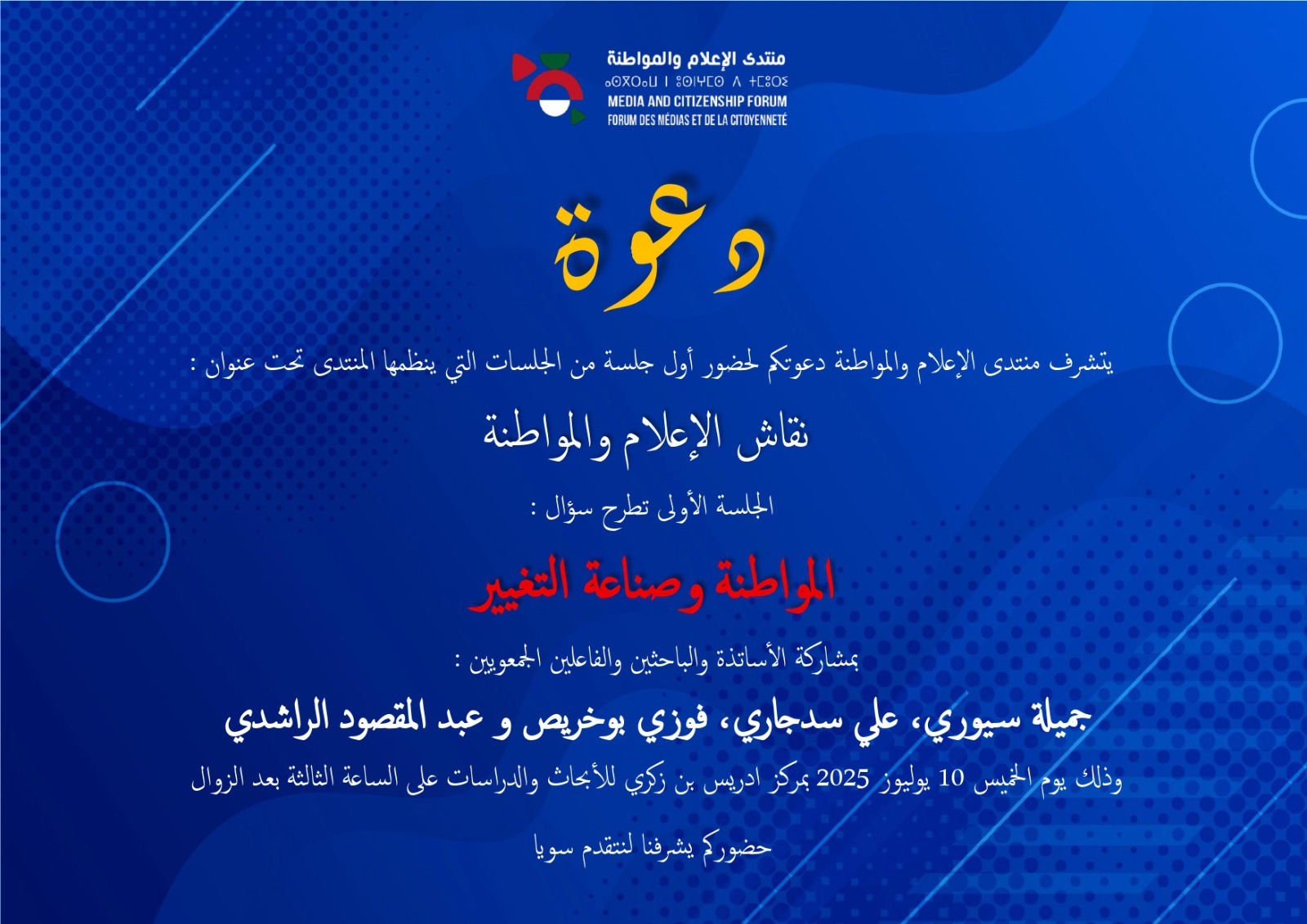 ينظم منتدى الإعلاموالمواطنة أول جلسة ضمن سلسلة جلسات للتفكير الجماعي والنقاش حول تيمة: الإعلاموالمواطنة، تحت عنوان: "المواطنة وصناعة التغيير"، وذلك الخميس 10يوليوز 2025 على الساعة الثالثة زوالاً، بمركز ادريس بنزكري للدراسات والأبحاثبيعقوب المنصور بالرباط. (قرب إقامة الصباح)