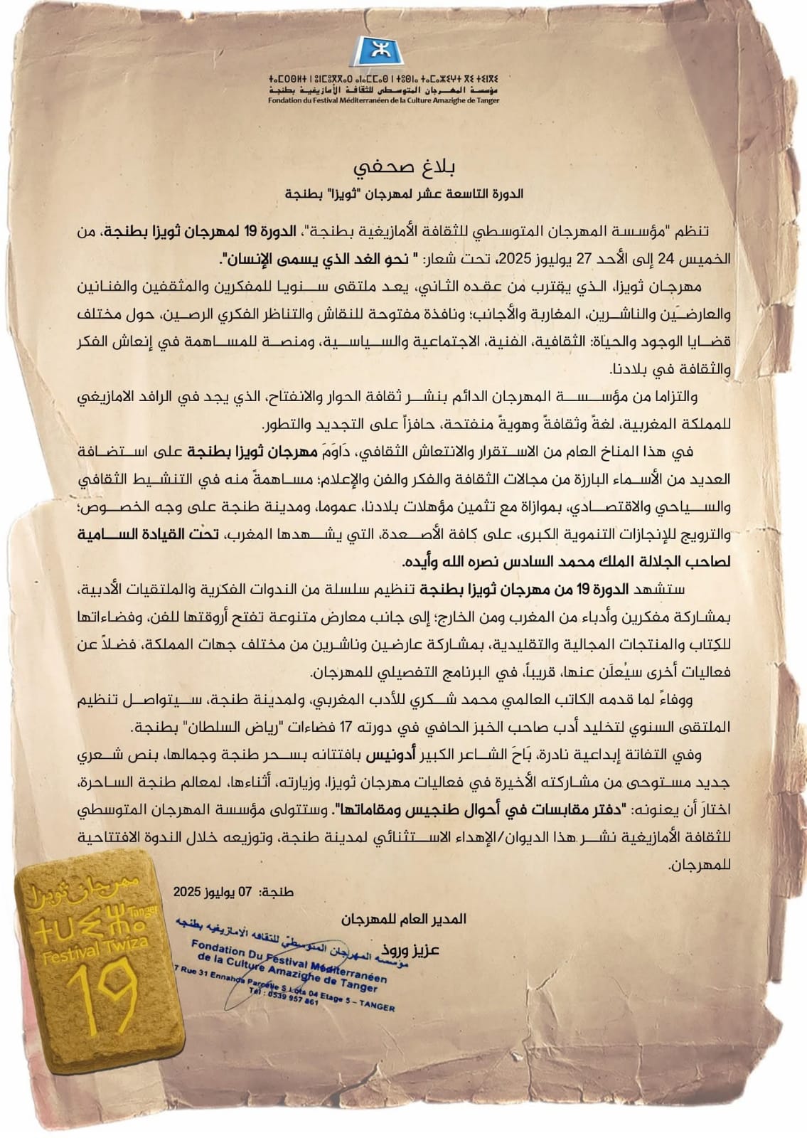 والتزاما من مؤسسة المهرجان الدائم بنشر ثقافة الحوار والانفتاح، الذي يجد في الرافد الامازيغي للمملكة المغربية، لغةً وثقافةً وهويةً منفتحة، حافزاً على التجديد والتطور.