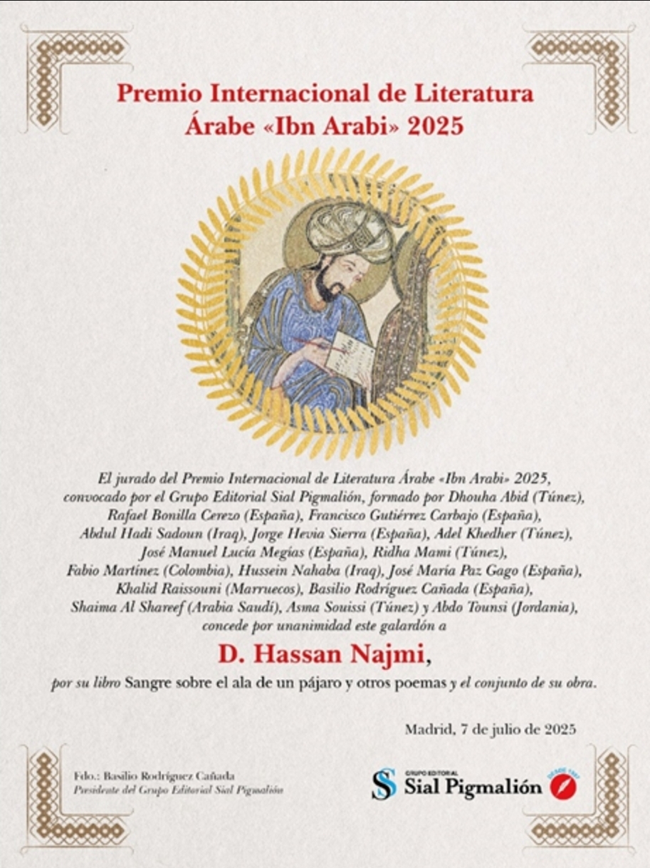 وتُرشّح لجنة تحكيم مرموقة كل سنة كتّابًا ناطقين باللغة العربية تميّزوا في مختلف الأجناس الأدبية، بالإضافة إلى مترجمين وباحثين هسبانيين... وتُمنح لهم هذه الجائزة التي تُكرّم شخصية الصوفي والفيلسوف والشاعر والرحالة والباحث المسلم الأندلسي ابن عربي، المولود في مرسية لأب مرسي وأم من أصول أمازيغية. والذي اعتبره شيوخ الصوفية لقرون عديدة "أعظم المعلمين"، كما يُنشر عمل للمؤلف الفائز في إحدى مجموعات الكتب التي تصدرها دار النشر، ويتم عرضه في بعض أهم معارض الكتب في أوروبا وأمريكا وإفريقيا. وتتكون لجنة تحكيم دورة الجائزة لسنة 2025 كل من: ضحى عابد (تونس)، رافائيل بونيا سيريثو (إسبانيا)، فرانسيسكو غوتييريث كارباخو (إسبانيا)، عبد الهادي سعدون (العراق)، خورخي هيفيا سييرا (إسبانيا)، عادل خضر (تونس)، خوسيه مانويل لوسيا ميخياس (إسبانيا)، رضا مامي (تونس)، فابيو مارتينيث (كولومبيا)، حسين نهابة (العراق)، خوسيه ماريا باث غاغو (إسبانيا)، خالد الريسوني (المغرب)، باسيليو رودريغيث كانيادا (إسبانيا)، شيماء الشريف (المملكة العربية السعودية)، أسماء السويسي (تونس)، عبده التونسي (الأردن). وقد منحت الجائزة بالإجماع للأستاذ حسن نجمي عن كتابه "دم على جناح طائر وقصائد أخرى" وعن مجموع أعماله، وسيُنشر الكتاب ضمن إحدى مجموعات دار النشر سيال بيغماليون، وسيُعرض في أهم معارض الكتب في العالم الناطق بالإسبانية، في غوادالاخارا (المكسيك)، سانتو دومينغو (جمهورية الدومينيكان)، فيلبو (بوغوتا، كولومبيا)، مدريد (إسبانيا)... وغيرها.