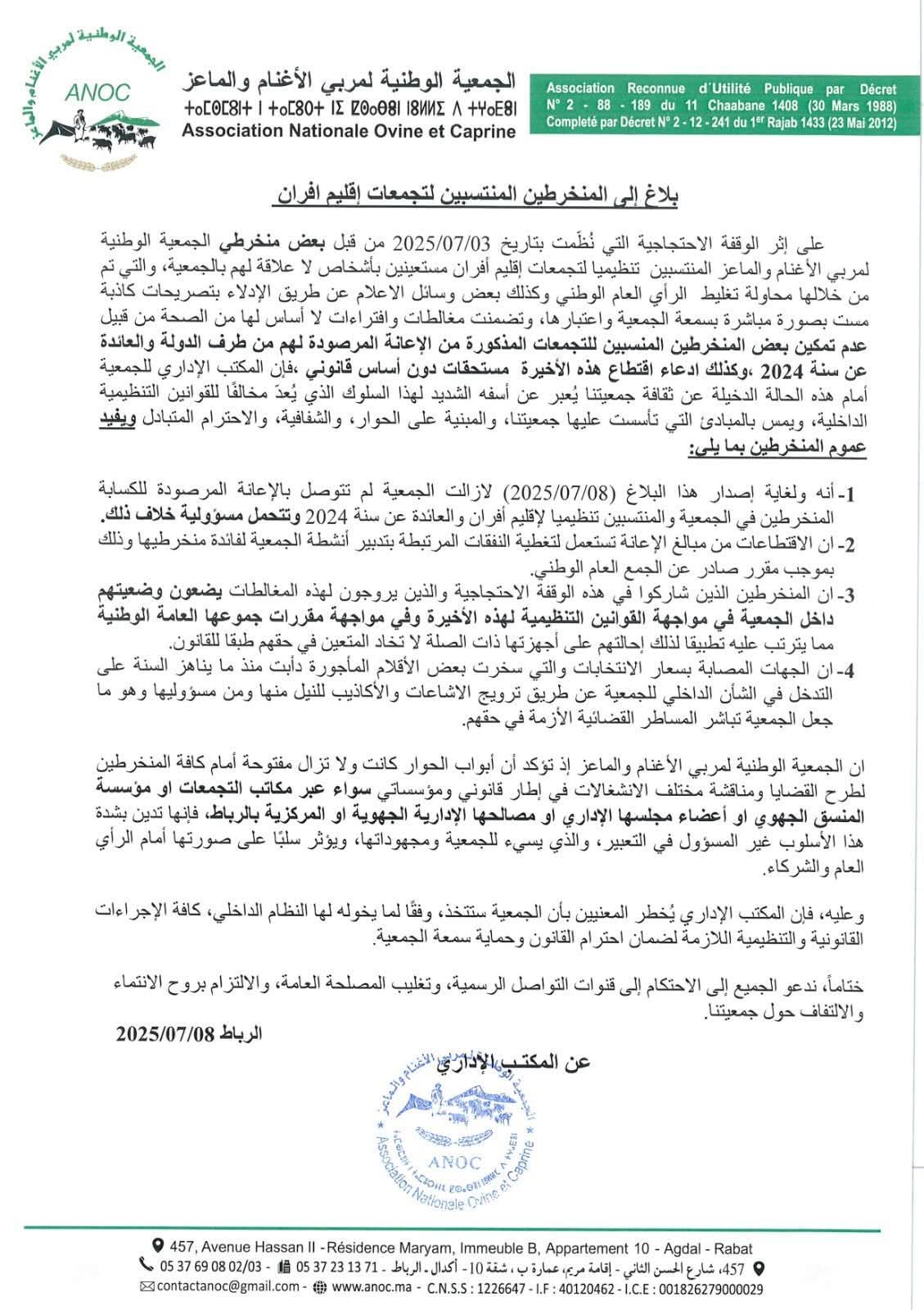 عبر المكتب الإداري للجمعية الوطنية لمربي الأغنام والماعز، عن أسفه الشديد إثر الوقفة الاحتجاجية التي نُظمت بتاريخ 2025/07/03 من قبل بعض منخرطي الجمعية المنتسبين تنظيمياً لتجمعات إقليم إفران، لافتا إلى أن هذه الوقفة شابتها بعض المغالطات والافتراءات التي تم ترويجها عن طريق تصريحات كاذبة مست بصورة مباشرة بسمعة الجمعية واعتبارها.