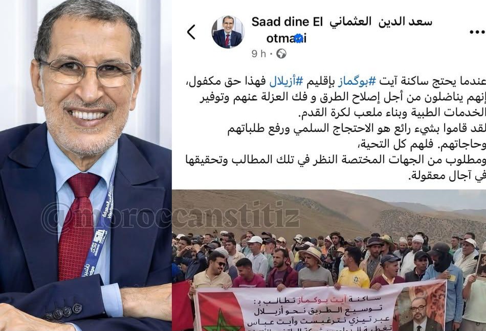 كتب رئيس الحكومة السابق، سعد الدين العثماني على صفحته الرسمية على الفايسبوك، معلقا على مسيرة سكان أيت بوكماز، التي انتهت عند باب مقر عمال إقليم ازيلال، بالتزام السلطات الاقليمية بإيجاد حلول المطالب الساكنة:"عندما يحتج ساكنة آيت #بوگماز بإقليم #أزيلال فهذا حق مكفول، إنهم يناضلون من أجل إصلاح الطرق و فك العزلة عنهم وتوفير الخدمات الطبية وبناء ملعب لكرة القدم.