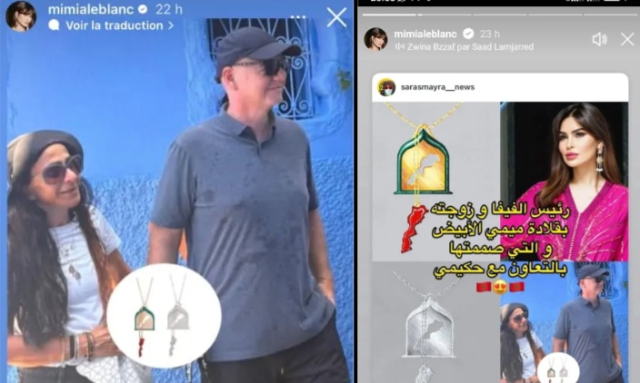 أعربت مصممة المجوهرات المغربية مريم الأبيض، المعروفة بلقب “ميمي”، عن فخرها برؤية قلادة صممتها في عنق زوجة رئيس الاتحاد الدولي لكرة القدم "فيفا" جياني إنفانتينو.