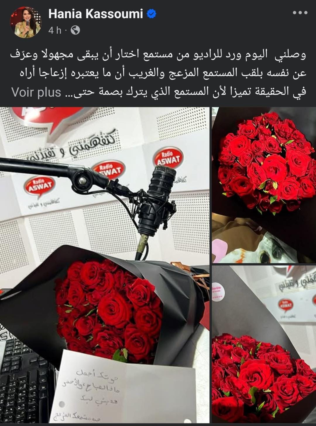 وختاماً، توجهت هنية القسومي برسالة شكر إلى المستمع المجهول، قائلة: "شكراً لك أيها المستمع المزعج كما تحب أن تسمي نفسك، فقد أسعدت يومي وأرسلت لي ما يذكرني أن وراء كل أثير هناك قلب يشاركني الدفء بطريقته الخاصة. كل الاحترام والتقدير لك على هذه الحركة الجميلة".