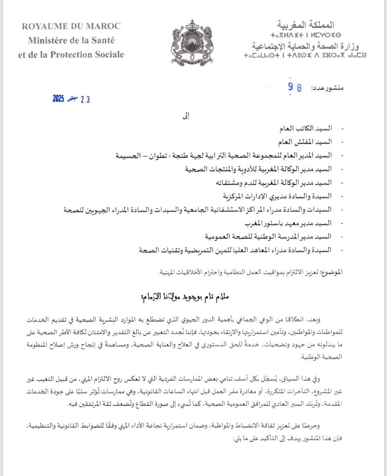 أصدر وزير الصحة والحماية الاجتماعية يوم 23 شتنبر 2025 منشوراً جديداً (رقم 98) يهدف إلى تعزيز الانضباط المهني والالتزام الوظيفي داخل مختلف المؤسسات الصحية والإدارات التابعة لها، وذلك تفاعلا مع تزايد الاحتجاجات الشعبية أمام عدد من المستشفيات الجهوية والإقليمية، تنديدا بتردي الخدمات الصحية.