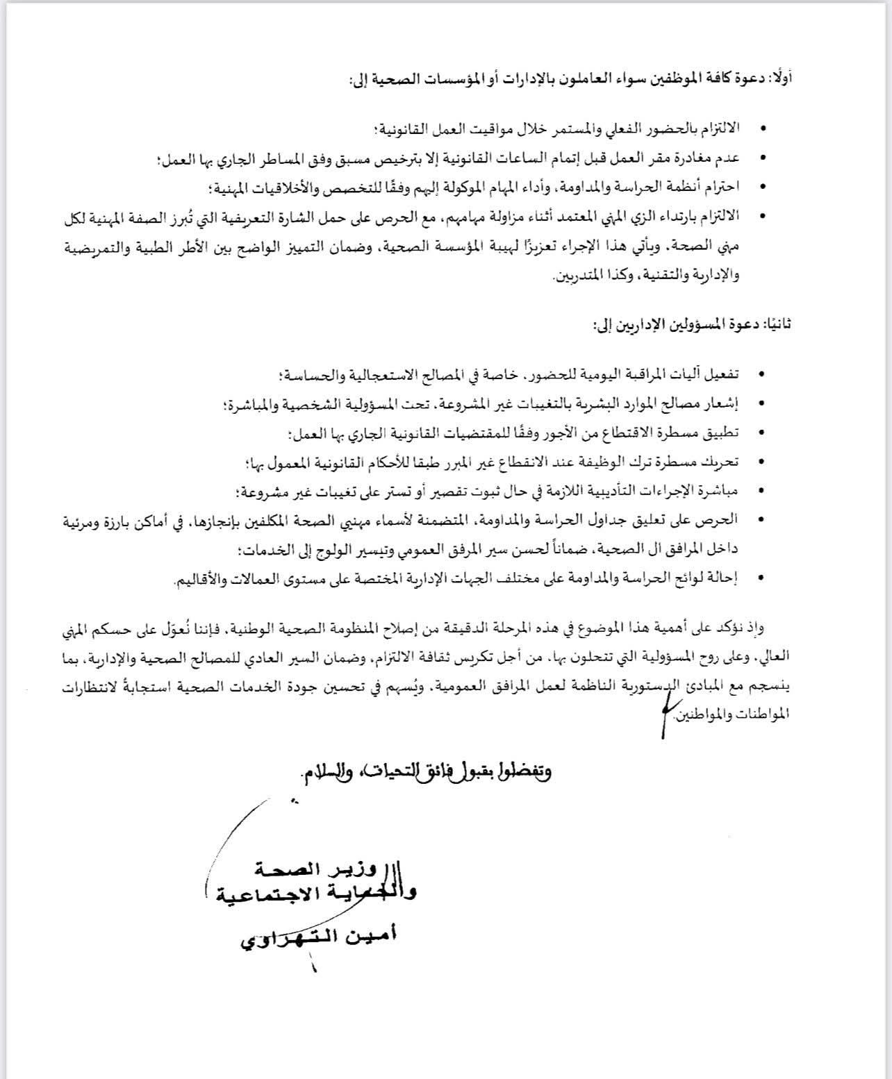 وشددت الوثيقة، توصلت بها "كفى بريس"، على ضرورة الحضور المنتظم واحترام أوقات العمل القانونية من طرف جميع الأطر الصحية والإدارية، مع منع مغادرة مقرات العمل إلا بترخيص مسبق.
