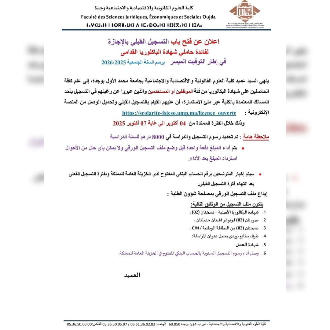 أثار إعلان كلية العلوم القانونية والاقتصادية والاجتماعية بوجدة عن فرض رسوم جديدة على الموظفين والأجراء الراغبين في متابعة دراستهم الجامعية جدلاً واسعًا في الأوساط الأكاديمية والنقابية، حيث شملت جميع الأسلاك، وبلغت 8000 درهم سنويًا لطلبة الإجازة و18000 درهم سنويًا لطلبة الماستر.