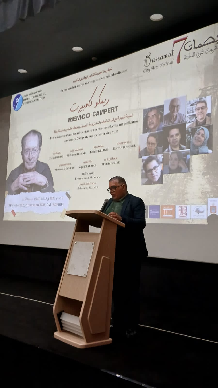 تأكيداً على أهمية كمبرت (1929-2022) كأحد رواد "حركة الخمسينيات" ونيلِه جوائز أدبية رفيعة مثل جائزة الأدب الهولندي (2015)، افتُتحت الأمسية بدراسة نقدية عن مسيرته قدمها الشاعر العراقي محمد الأمين، مدير مؤسسة ميزوبوتاميا.