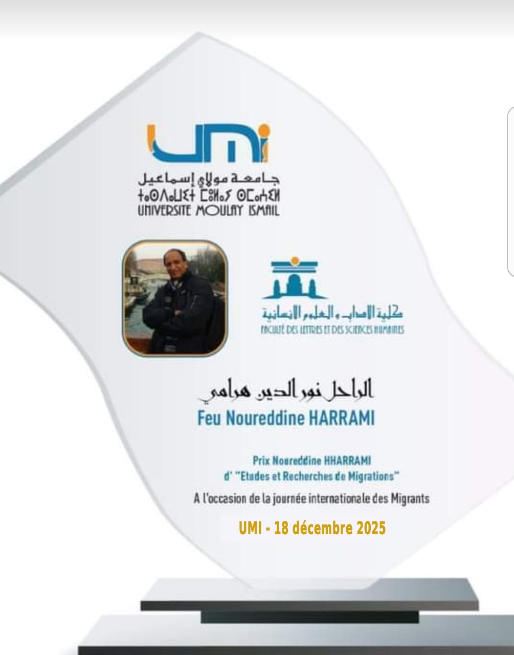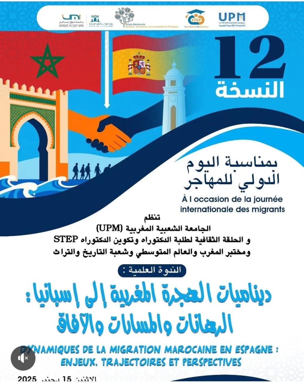 احتضنت كلية الآداب والعلوم الإنسانية بجامعة مولاي إسماعيل بمكناس، الإثنين 15 دجنبر 2025، فعاليات النسخة الثانية عشرة لندوة إحياء اليوم الدولي للمهاجر، بتنظيم مشترك بين الجامعة الشعبية المغربية (Université Populaire du Maroc – UPM)، والحلقة الثقافية لطلبة الدكتوراه وتكوين سلك الدكتوراه (STEP)، وماستر تاريخ حركات الهجرة في البحر الأبيض المتوسط.