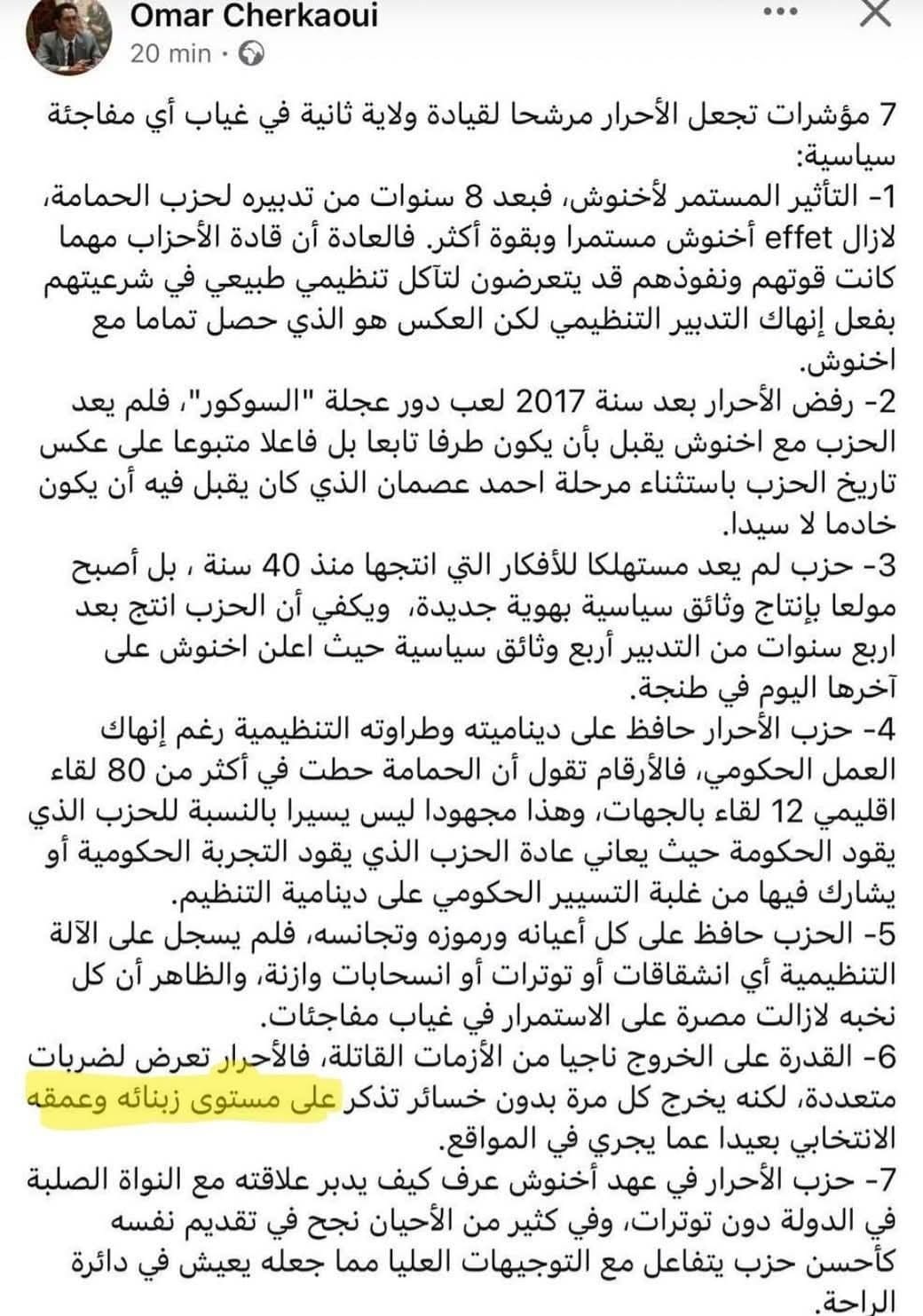 و أما الخطاب الدفاعي الذي يأتي من "المهووس بـ'الأخنشة'" فيؤكد أن الأمر لا يتعدى كونه "إدارة زبائن" لا "قيادة وطن".