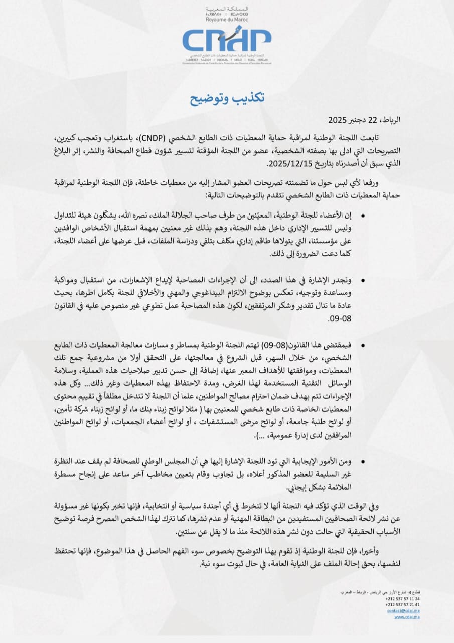 وعلى صعيد آخر، أكدت الهيئة أن دورها الرقابي بمقتضى القانون يركز بالأساس على مشروعية معالجة المعطيات وسلامة الوسائل التقنية المستخدمة وفترة الاحتفاظ بها، دون التدخل بأي شكل من الأشكال في المحتوى التفصيلي للمعطيات الشخصية للمواطنين، سواء كانت لوائح بنكية، صحية، أو مهنية.