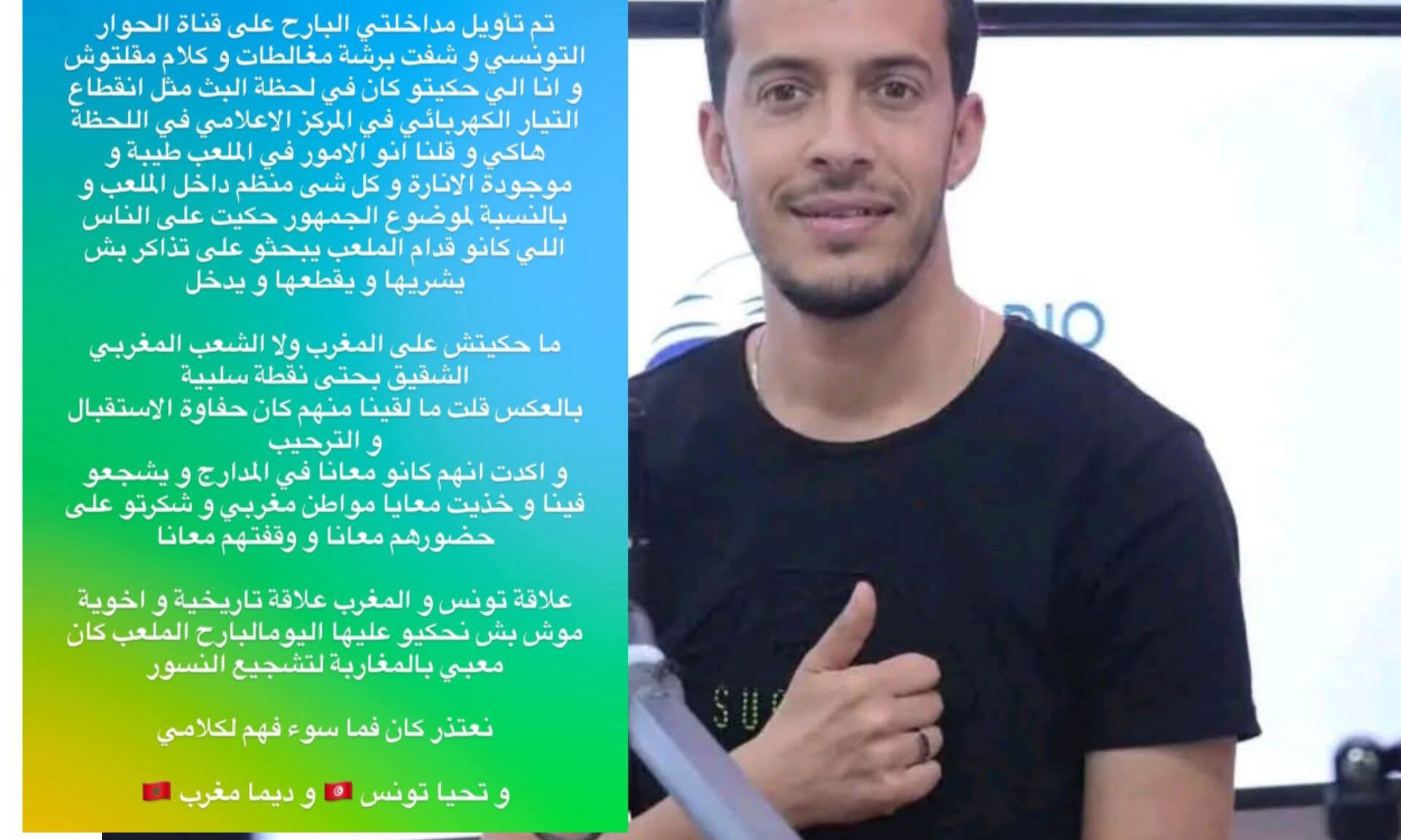 واختتم الإعلامي التونسي رسالته بتقديم اعتذار صريح قائلاً: "نعتذر إذا كان هناك سوء فهم لكلامي"، مذيلاً تدوينته بعبارات المحبة للبلدين "تحيا تونس ودائما مغرب".