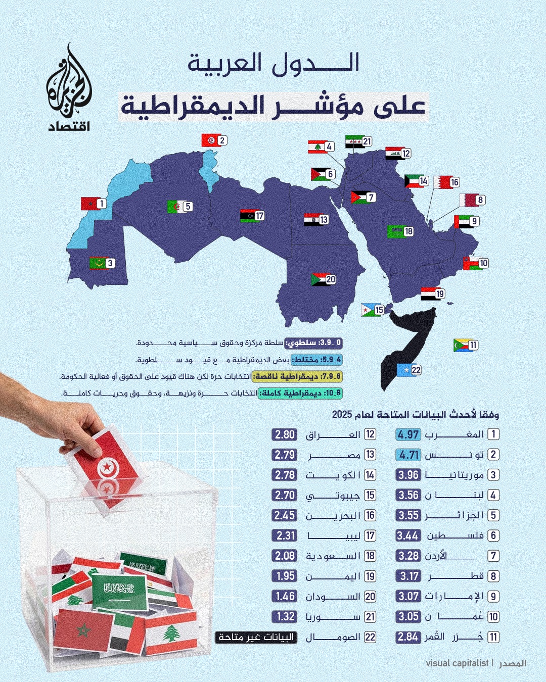 تصدر المغرب قائمة البلدان العربية في مؤشر الديمقراطية، بحصوله على 4.97 نقطة متبوعا بتونس في المرتبة الثانية بـ 4.71 وتذيلت القائمة اليمن والسودان وسوريا والصومال.