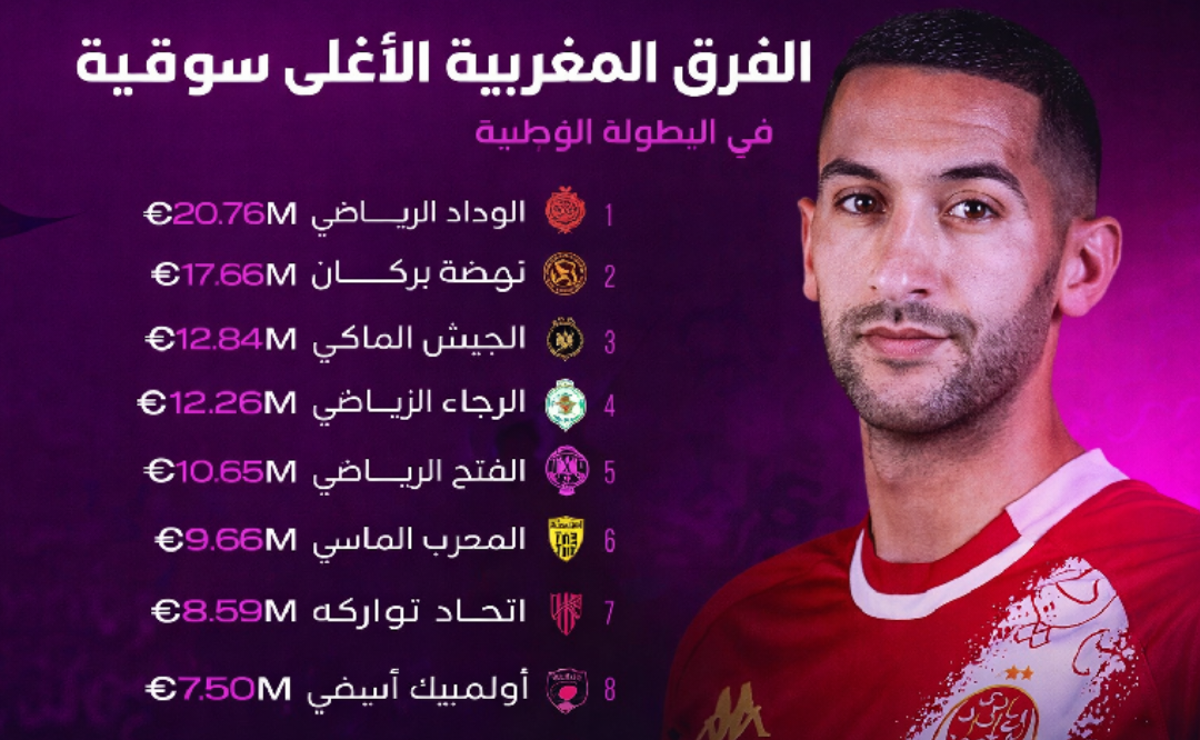 وضمت القائمة كذلك أندية المغرب الفاسي، اتحاد تواركة، أولمبيك آسفي، حسنية أكادير ونهضة الزمامرة، ما يعكس التفاوت في القيم التسويقية بين أندية البطولة، ويؤكد استمرار هيمنة الأندية الكبرى تاريخيًا وتنظيميًا على المشهد الكروي الوطني.