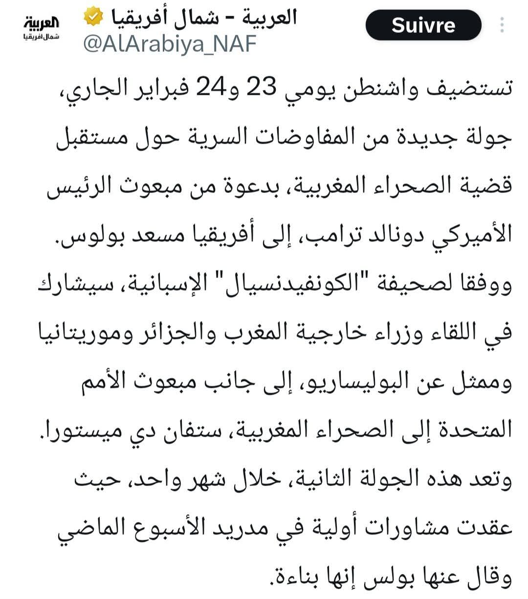 لكن المغاربة استغربوا أمس من إقدام مكتب قناة العربية في شمال إفريقيا على نشر خبر في صفحته، معزز بصورة، يتحدث فيه عن جولة ثانية من المفاوضات حول الصحراء المغربية تستضيفها واشنطن تنفيذا للقرار الأممي 2797، مستعملا عبارة الصحراء الغربية بدل عبارة الصحراء المغربية التي يتم استعمالها في أخبار القناة، وواضعا في الصورة راية العصابة المسماة بوليساريو وكأن الأمر يتعلق براية دولة ذات سيادة ومعترف بها في الأمم المتحدة، بينما الحال أنها مجرد عصابة مسلحة تؤويها وتمولها الجزائر لخلق دولة تابعة لها بين المغرب وموريتانيا تضمن لها التوسع في منطقة الصحراء والوصول إلى المحيط الأطلسي.
