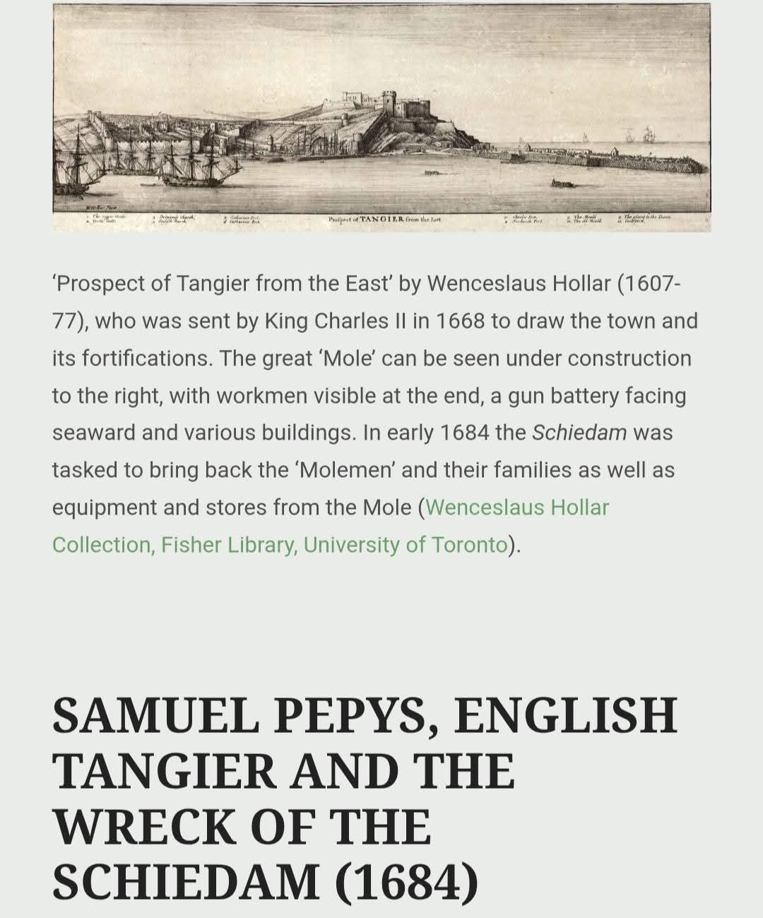 🔹️المجموعة الملكية البريطانية (Royal Collection Trust): رسم بانورامي لمدينة طنجة (Prospect of Tangier) بريشة الفنان وينسيسلاوس هولار (1669)، يوثق التحصينات قبل الجلاء.