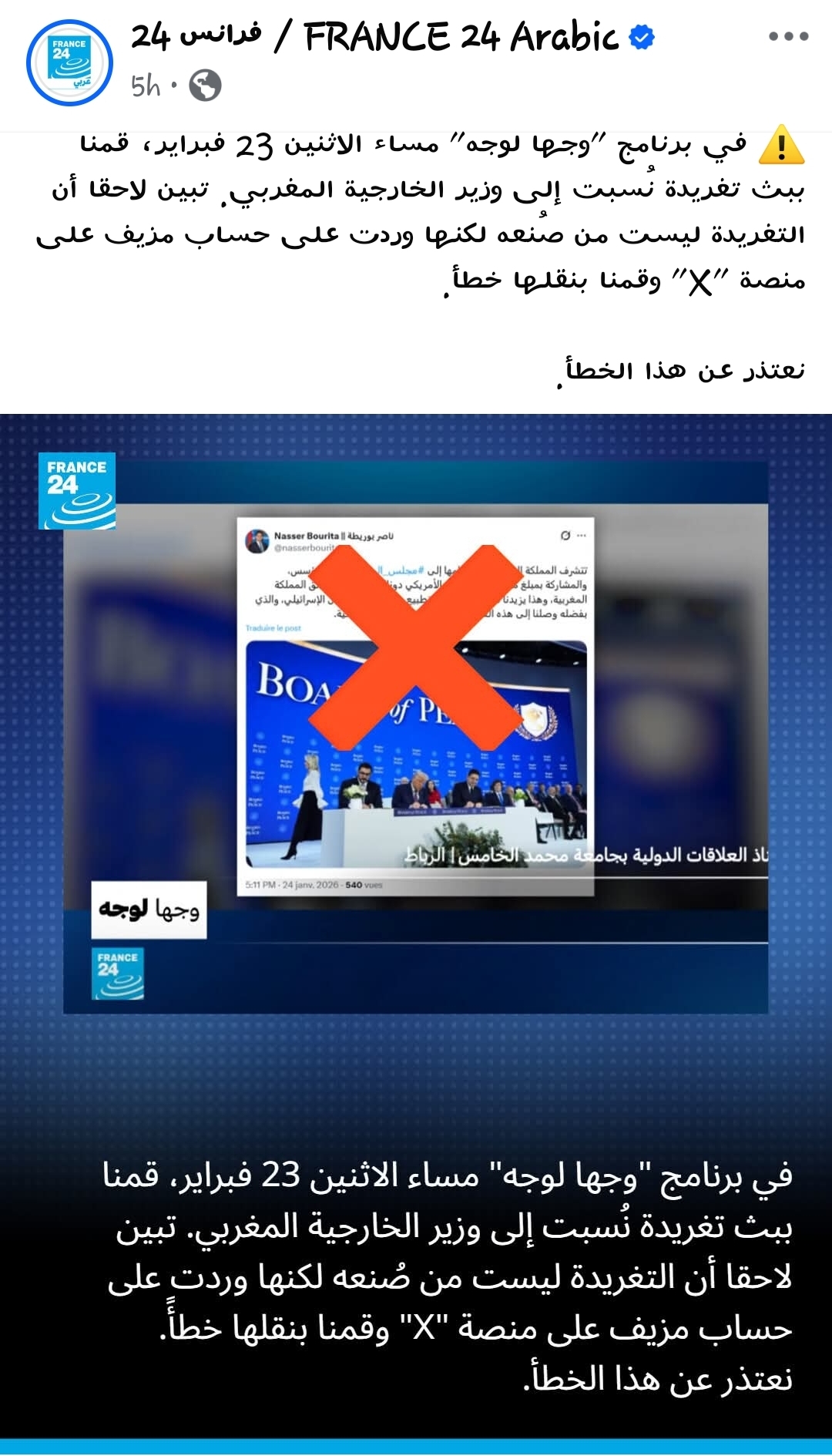 لقد تحولت "فرانس 24" بترويجها لتدوينة مفبركة من منبر للإخبار إلى خندق لتصريف السموم الإعلامية. إن استسهال نسب تصريحات حساسة لوزير خارجية دون أدنى وازع مهني يكشف أن القناة لم تعد معنية بنقل الحقيقة، بل بصناعة "بروباغندا" سوداء تخدم أطرافاً بعينها، محولةً شاشتها إلى ساحة لتصفية الحسابات السياسية البالية التي عفا عليها الزمن.