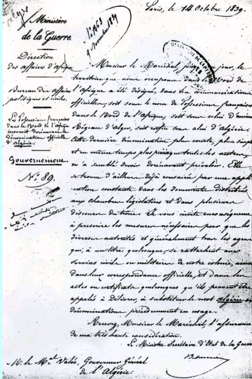 وفي مقابل هذه الشرعية التاريخية الميدانية، لجأت فرنسا بعد تسع سنوات من هذا التوسع المغربي، وتحديداً في 14 أكتوبر 1839، إلى "مناورة إدارية" قادها وزير الحرب "فيرجيل شنايدر" (Virgile Schneider). ففي مراسلته الشهيرة للمشير "سيلفان شارل فالي" Sylvain Charles Valée، أمر شنايدر بإلغاء مسميات مثل "الممتلكات الفرنسية في شمال إفريقيا" (Possessions françaises dans le Nord de l'Afrique) أو "إيالة الجزائر السابقة" (Ancienne Régence d'Alger)، وفرض مسمى مستحدثاً هو "آلجيري" (Algérie)؛ مبرراً ذلك بحجة "براغماتية" مثيرة للسخرية، وهي أن الاسم الجديد "أقصر وأبسط" (Plus court et plus simple) في تحرير التقارير العسكرية.