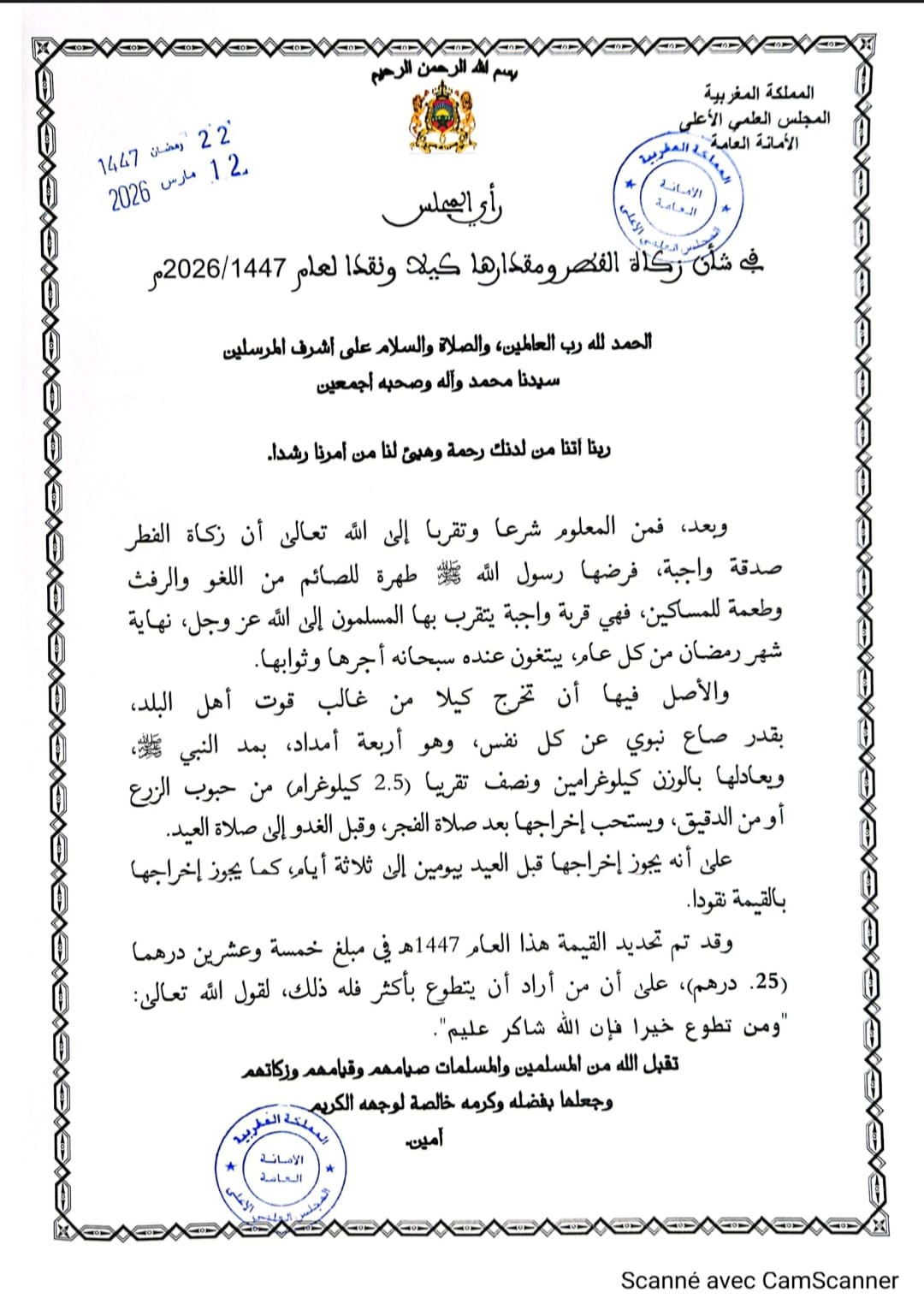 أعلن المجلس العلمي الأعلى عن تحديد قيمة زكاة الفطر نقداً برسم عام 1447هـ/2026م في مبلغ 25 درهماً عن كل فرد، مع التأكيد على أن من أراد إخراجها أكثر من ذلك تطوعاً فله أجره عند الله.