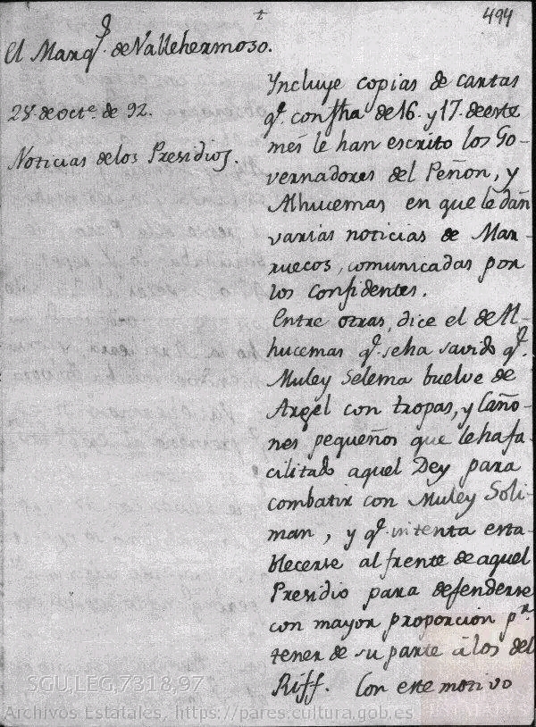 (...لأن حدوث ما أُشير إليه مما نُفذ في عام 1770 مع مولاي علي، سيؤدي إلى استهلاك غير مفيد للبارود، مما يتسبب كذلك في تدهور التحصينات دون طائل؛ ويجب الالتزام بما هو منصوص عليه في الأمر الملكي... لكي يقبله مع أبنائه وثلاثة أو أربعة خدم، ومعاملته بحفاوة حذرة، مما سيمكن من الاعتذار له إذا طالب بنفقات غير عادية).