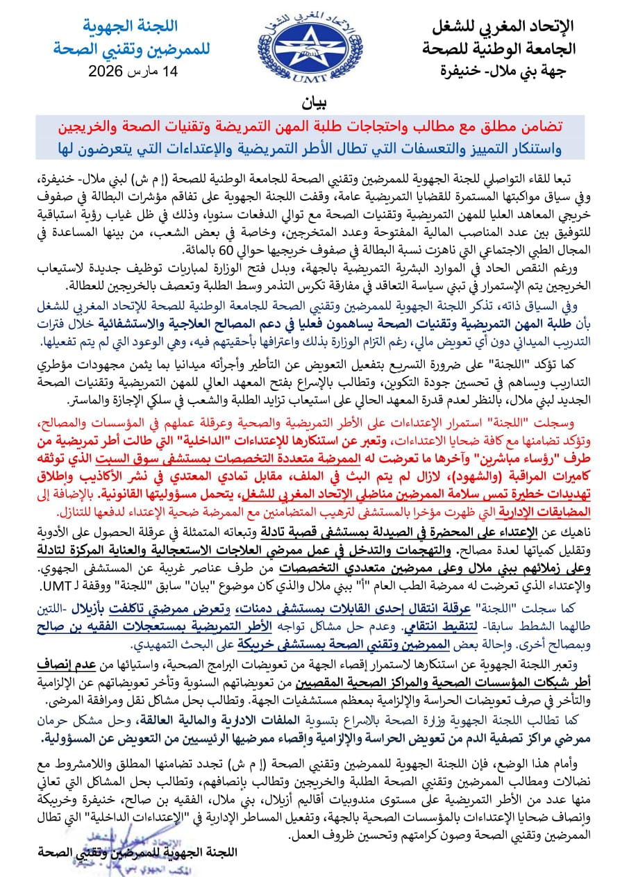 واختتمت اللجنة الجهوية بيانها بالمطالبة بالتعجيل بتسوية الملفات الإدارية والمالية العالقة، ومنها صرف تعويضات الحراسة والإلزامية والبرامج الصحية التي تم إقصاء أطر الجهة منها.
