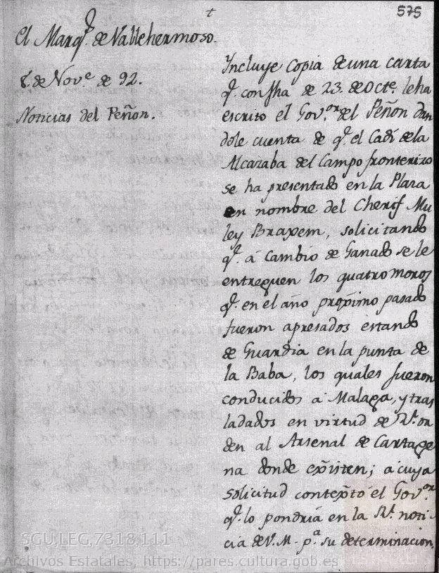 لقد قرأتُ على الملك رسالة سعادتكم المؤرخة في 31 من الشهر الماضي، والتي تتضمن نسخة من الرسالة التي كتبها حاكم "الصخرة" (Peñon) بتاريخ 23، بخصوص الطلب الذي قدمه قائد القصبة باسم الشريف مولاي إبراهيم، ملتمساً تسليم المغاربة الأربعة الذين أُسروا في العام الماضي أثناء نوبتهم في الحراسة بالنقطة المسماة "البابة"، وذلك مقابل قطيع من الماشية. وبعد اطلاع جلالته على كل الحيثيات، وعلى ما أفاد به المراقب (Veedor) دون رامون دي مونسالفي، قرر جلالته أن تنتظر سعادتكم الأوامر التي سيبلغكم بها السيد "كونت دي أراندا" بهذا الشأن؛ وهو ما أنقله لسعادتكم بموجب أمر ملكي للإحاطة والعلم. حفظكم الله.