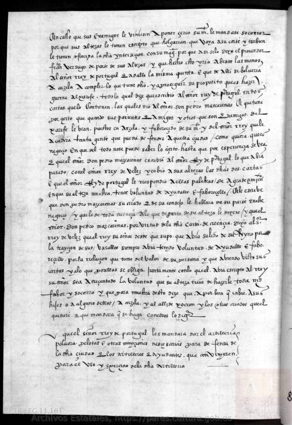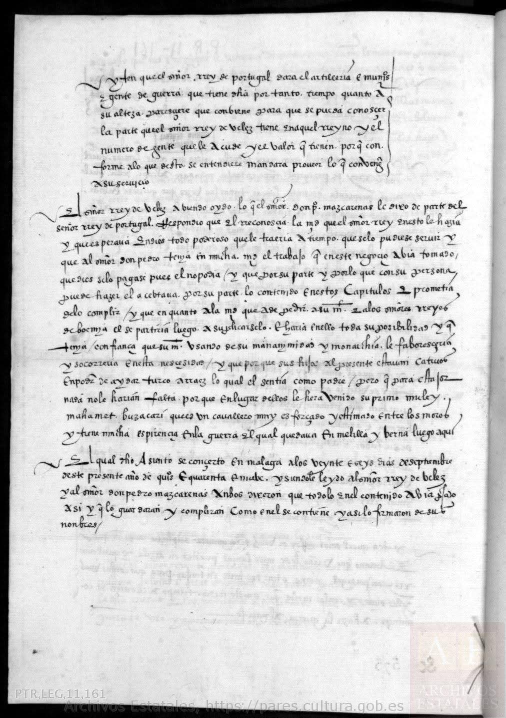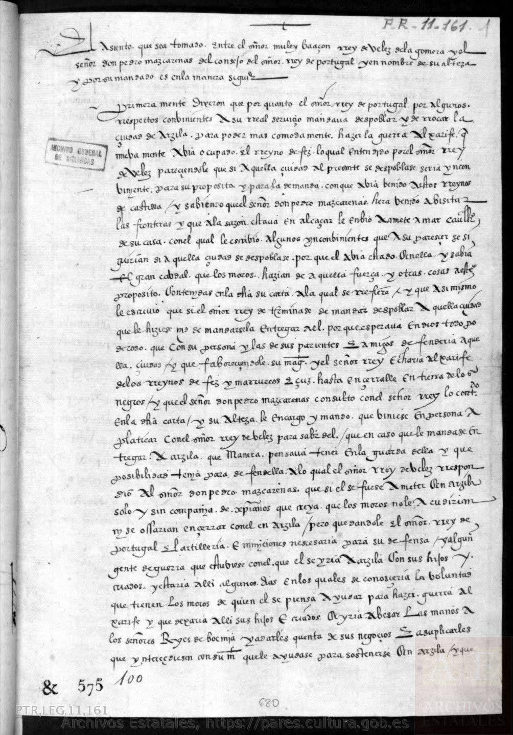 "Asento que sea tomado Entre el señor muley baaçón rrey de velez dela gomera y el señor don pedro mazcareñas del consejo del señor rrey de portugal... Primera mente dixeron que por quanto el señor rrey de portugal... mandava despoblar y derrocar la ciudad de Arzila para poseer mas comodamente hazer la guerra al xarife... le escrivio que si el señor rrey se terminase de mandar despoblar aquella ciudad que le hiziese m.d de mandarsela entregar a el porque esperava in dios todo poderoso que con su persona... defenderia aquella ciudad... y que el señor rrey echaria al xarife de los rreynos de fez y marruecos..."