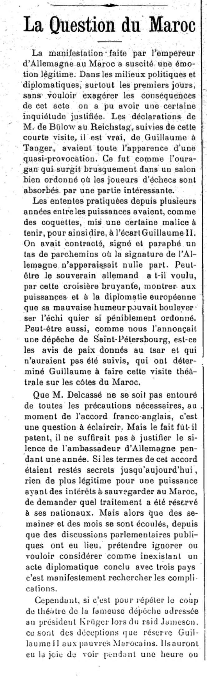 "La manifestation faite par l'empereur d'Allemagne au Maroc a suscité une émotion légitime... Ce fut comme l'ouragan qui surgit brusquement dans un salon bien ordonné."