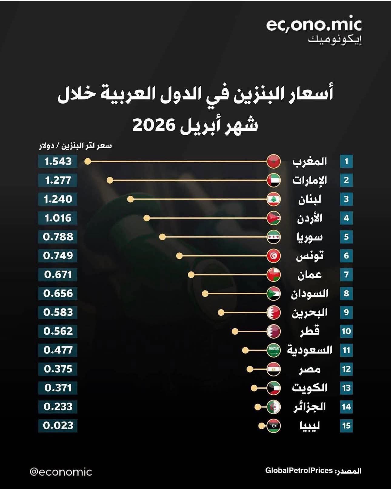 كشفت بيانات حديثة صادرة عن منصة "GlobalPetrolPrices" لشهر أبريل 2026، عن عمق الفجوة الصارخة بين أسعار المحروقات في المغرب وبقية المنظومة العربية، حيث يواصل المغرب التربع على عرش أغلى الدول العربية من حيث أسعار البنزين، مسجلاً 1.543 دولار للتر الواحد.