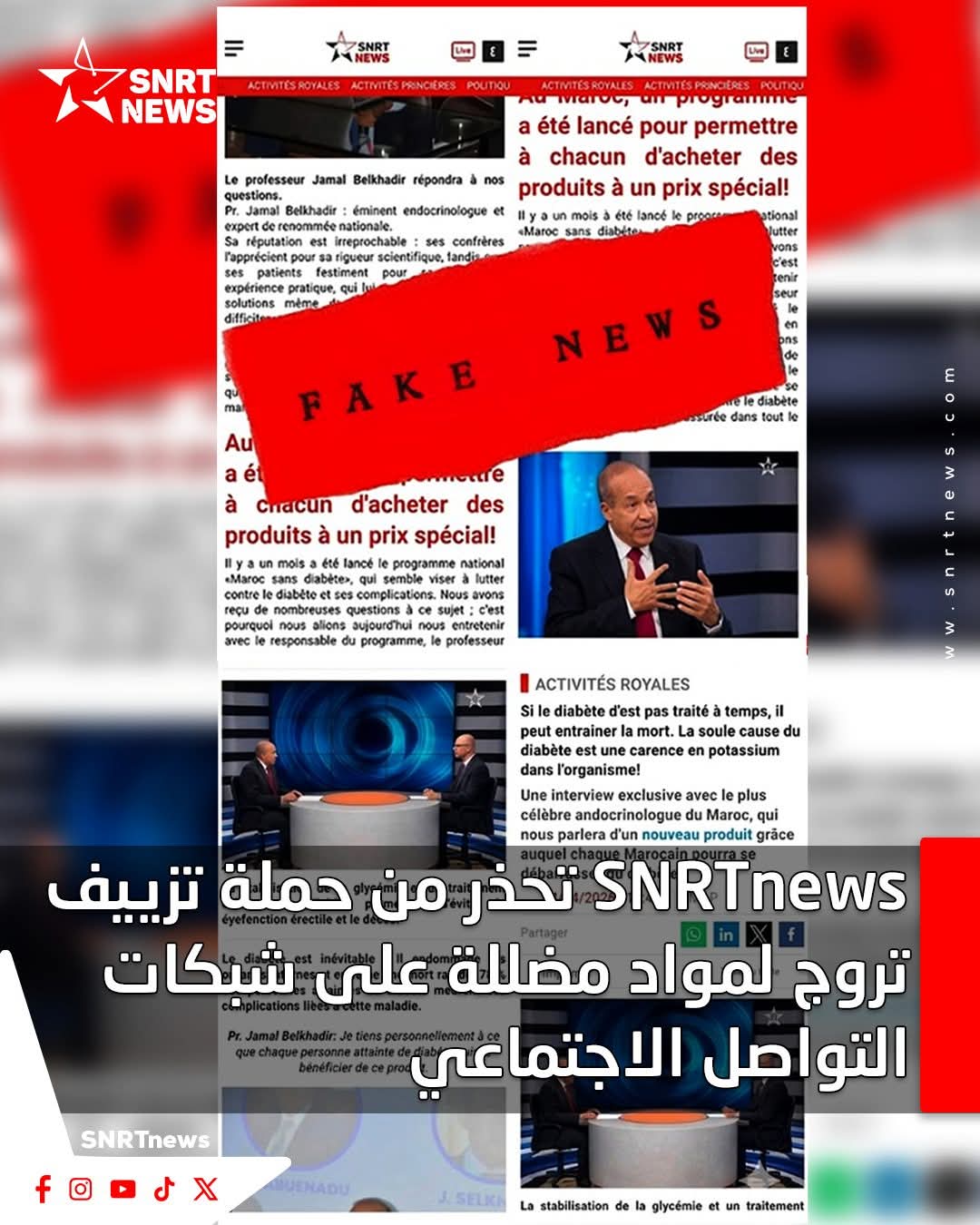 وكشفت المنصة أن هذه الحملة المغرضة تستغل اسم البروفيسور جمال بلخدير، المتخصص في طب الغدد والسكري، عبر إعادة توظيف محتويات إعلامية قديمة في سياقات مشبوهة للترويج لمنتجات مجهولة المصدر تدعي القدرة على علاج داء السكري.