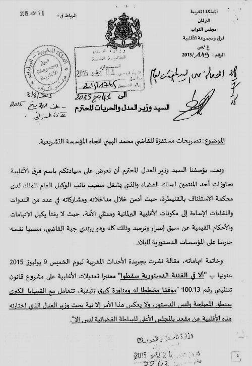 يشتكون بواسطتها من تجاوزات أحد المنتمين لسلك القضاء والذي يشغل منصب نائب الوكيل العام للملك لدى محكمة الإستئناف بالقنيطرة , حيث - تقول الشكاية - أدمن خلال مداخلاته ومشاركاته في عدد من الندوات واللقاءات الإساءة إلى مكونات الأغلبية البرلمانية وممثلي الأمة .