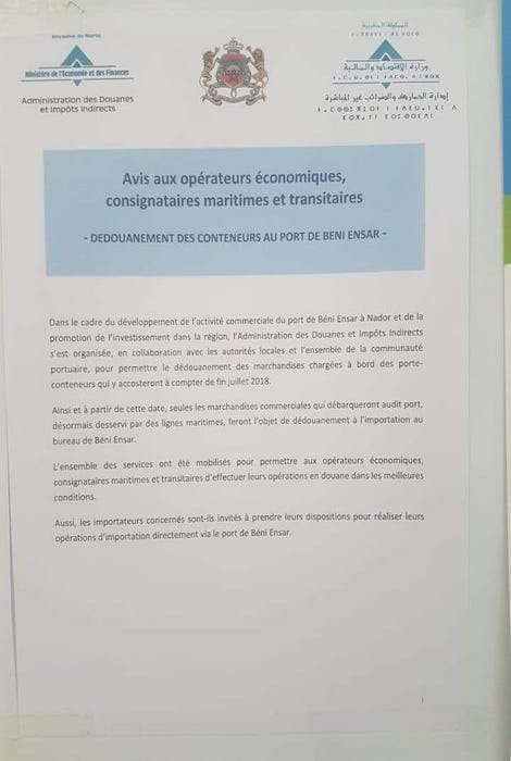 كما يشجع القرار المغربي وفق ما اود موقع " ارتيكل 19" الاستيراد والتصدير عبر ميناء بني أنصار بالناظور بتخفيض 30 في المائة من الرسوم الجمركية لكل البضائع التي ترسو في ذات الميناء.
