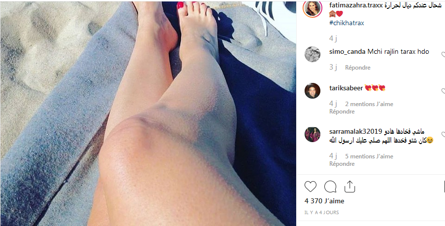نشرت الفنانة الشعبية الشيخة الطراكس صورة على حسابها الشخصي على " انستغرام"، تظهر فيها ساقيها وجزء من فخديها عاريين في البحر. لكن متتبعيها أنكروا أن يكون الجزء السفلي من الجسد الذي ظهر في الصورة لها بدعوى أنها ممتلئة أكثر مما في الصورة.