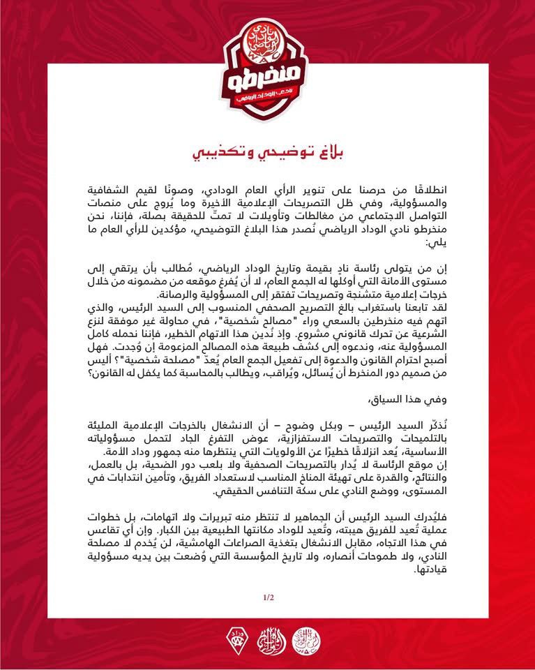 وختم البيان بدعوة جماهير الوداد إلى التحلي بالوعي والمسؤولية، وعدم الانجرار وراء ما اعتبروه "إشاعات وأقلام مأجورة تسعى لتزييف الوعي وتغليط الرأي العام"، مؤكدين أن تحركهم “جماعي، قانوني، واضح ومسؤول”، ومبني على قناعة بضرورة احترام القوانين، وإعادة الاعتبار لمؤسسة المنخرطين، وفتح نقاش مؤسساتي حول مستقبل النادي وفق قواعد الحكامة الجيدة والمصلحة العليا للوداد.