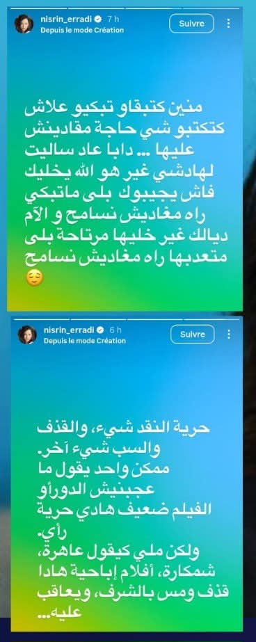 بعثت الممثلة المغربية نسرين الراضي، تحذيرًا شديد اللهجة إلى منتقديها، مؤكدة أنها لن تواصل تجاهل تعرضها لسلسلة من السب والقذف عبر منصات التواصل الاجتماعي.