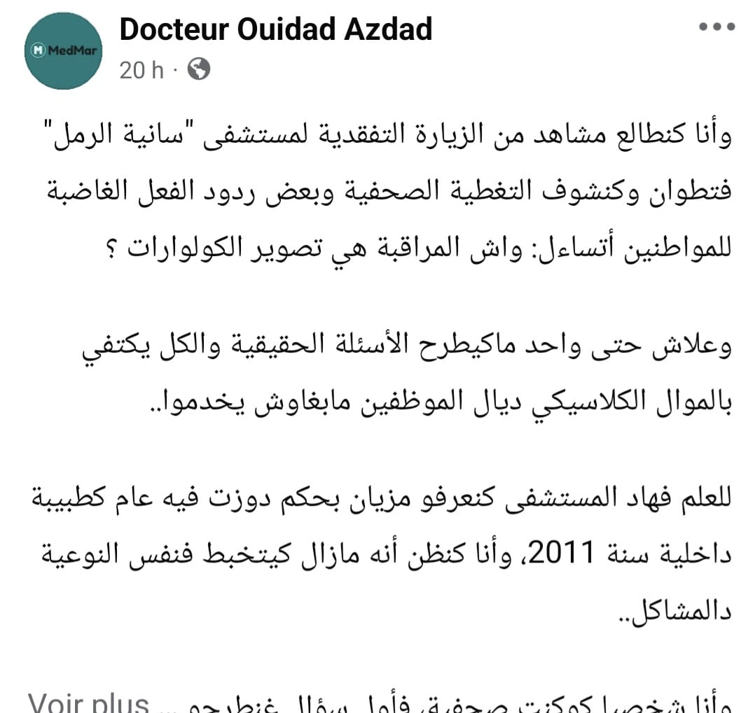 وعوض مانبقا نصور الزليج والدهاليز، فغندخل للمصالح الطبية ونوري للمواطن الحجم ديالها الحقيقي وحالتها وعدد الأسرة فيها، باش نتصدموا مجموعين..
