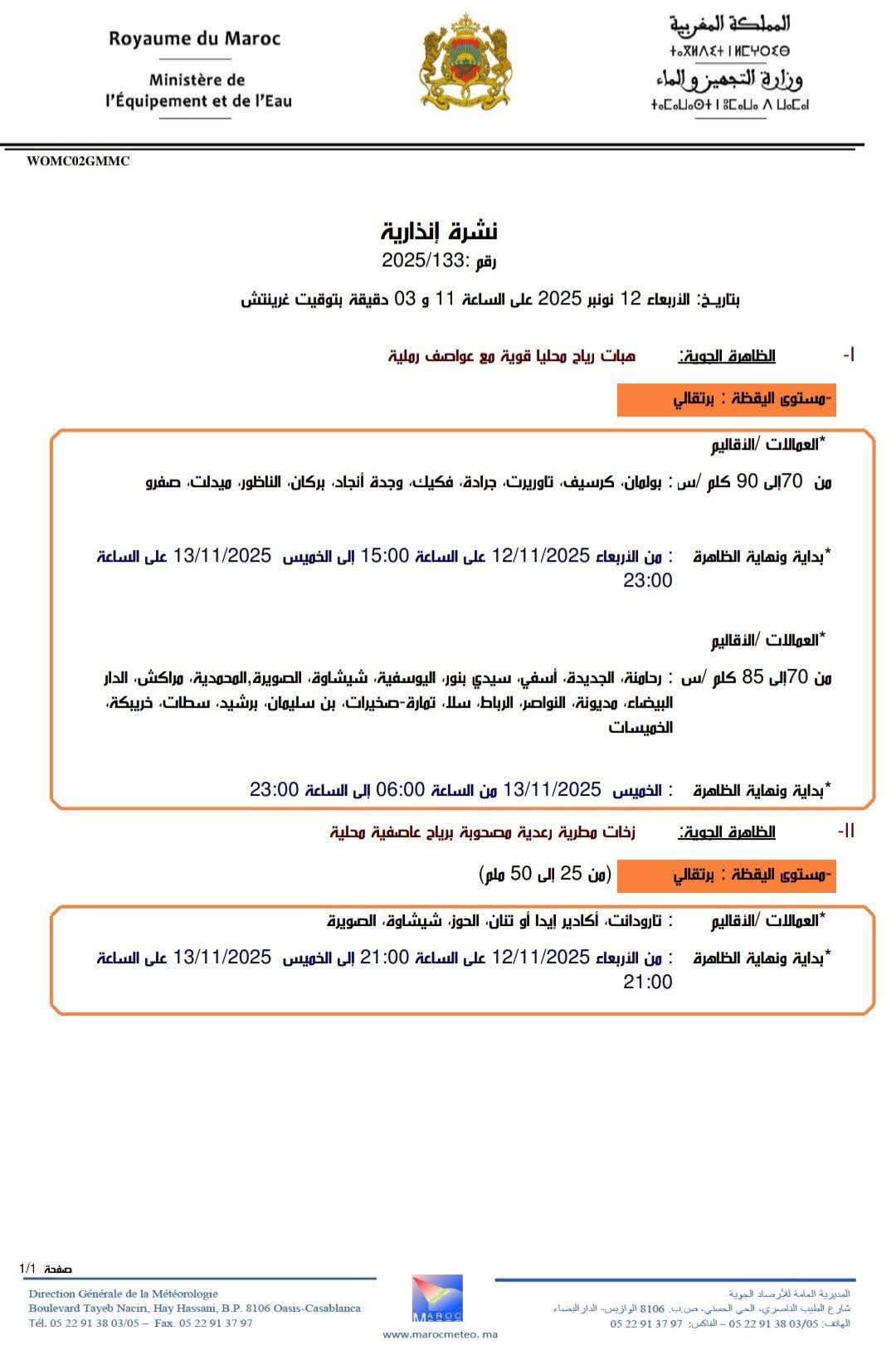 وحسب نشرة إنذارية صدرت تحت رقم 2025/133، من المرتقب أن تتراوح سرعة الرياح بين 70 و90 كيلومتراً في الساعة بكل من بولمان، كرسيف، تاوريرت، جرادة، فكيك، وجدة أنجاد، بركان، الناظور، ميدلت وصفرو، وذلك ابتداءً من الأربعاء 12 نونبر على الساعة الثالثة بعد الزوال إلى غاية الخميس 13 نونبر على الساعة الحادية عشرة ليلاً.