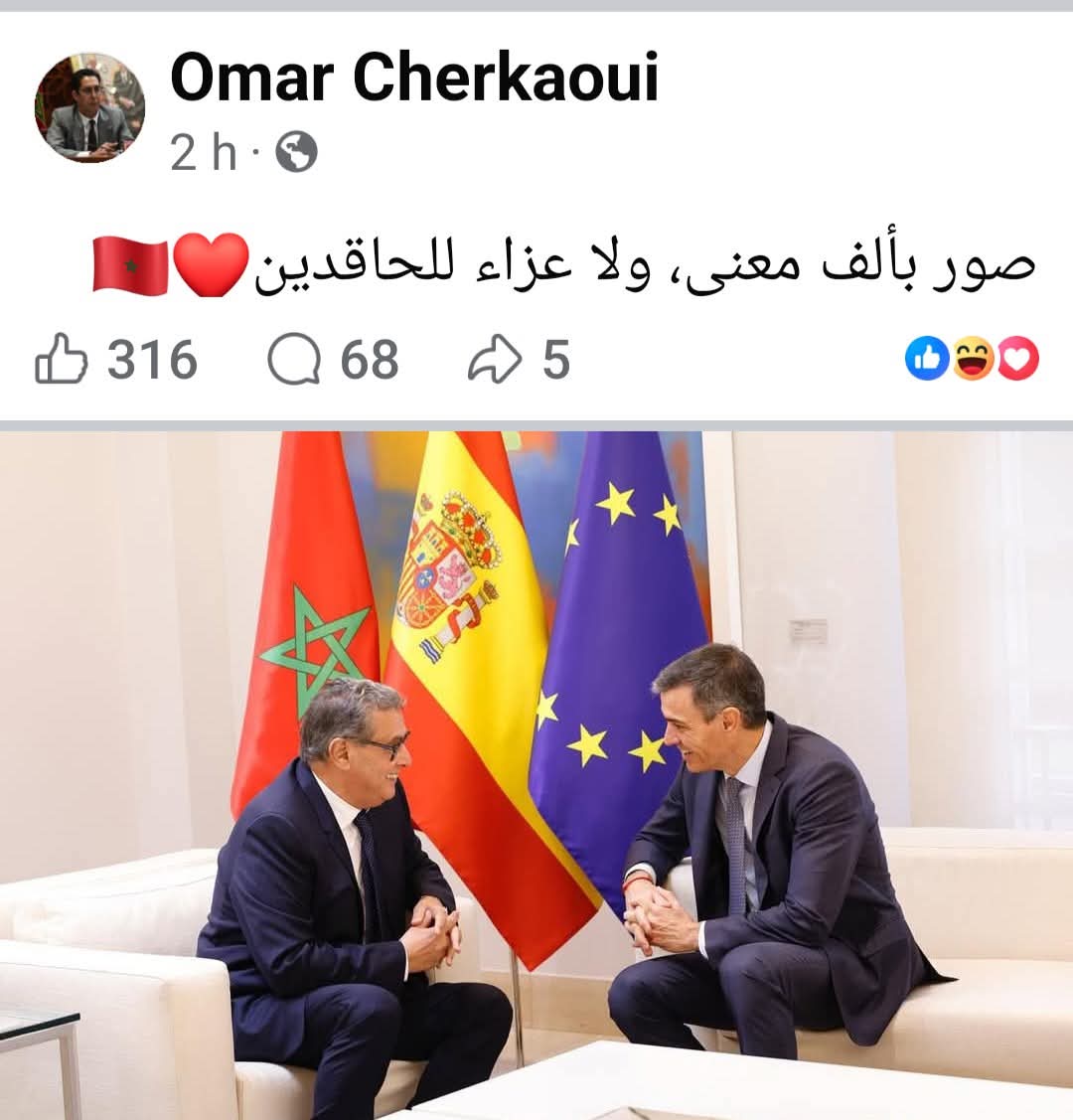 لا شيء يعبّر عن الإنهيار الثقافي الذي نعيشه أكثر من تعليق عمر الشرقاوي على صورة تجمع رئيس الحكومة المغربي بنظيره الإسباني: “صورة بألف معنى ولا عزاء للحاقدين”.