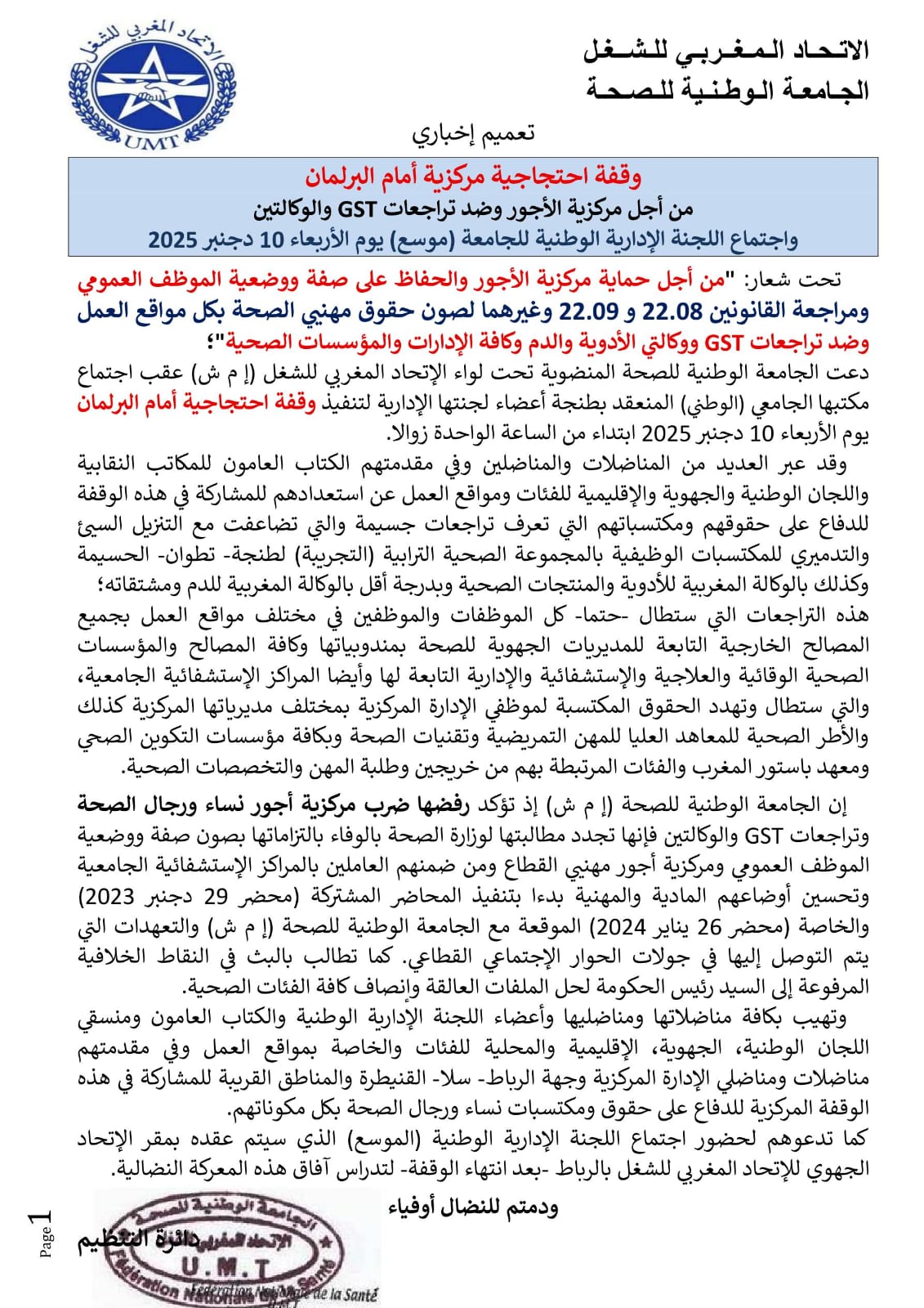 وجددت الجامعة الوطنية للصحة رفضها القاطع لأي مساس بمركزية أجور مهنيي القطاع، مطالبة وزارة الصحة والحماية الاجتماعية بالوفاء بالتزاماتها المتمثلة في صون صفة الموظف العمومي وتحسين الأوضاع المادية والمهنية للعاملين. كما دعت الوزارة إلى التسريع بتنفيذ مضامين المحاضر الموقعة (محضر 29 دجنبر 2023 ومحضر 26 يناير 2024)، والبث في النقاط الخلافية العالقة المرفوعة إلى رئيس الحكومة لإنصاف كافة الفئات المتضررة.