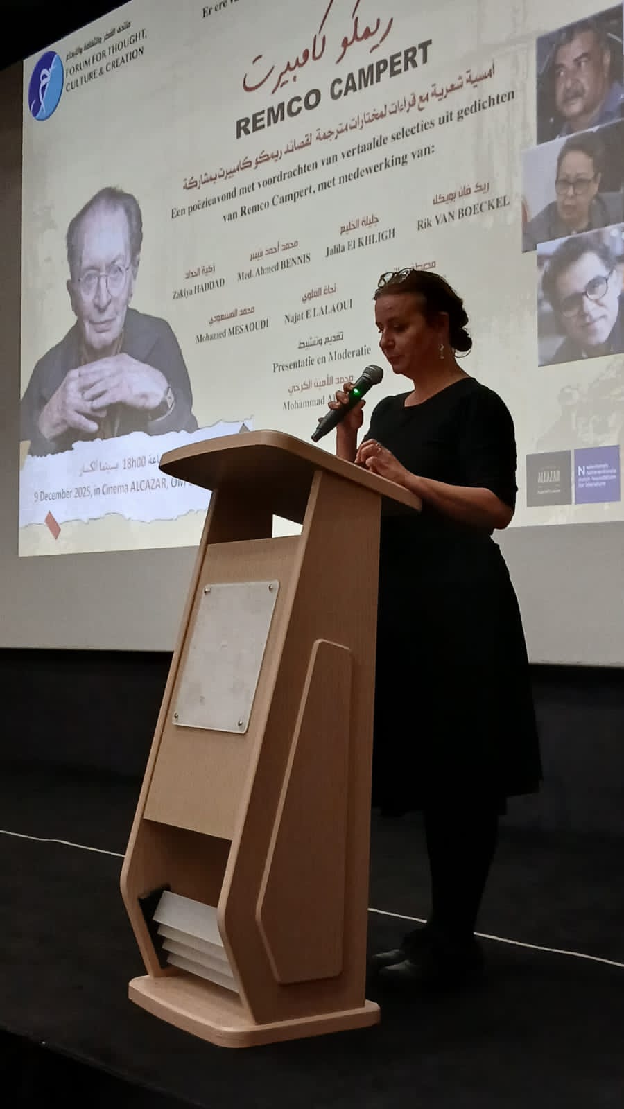 تأكيداً على أهمية كمبرت (1929-2022) كأحد رواد "حركة الخمسينيات" ونيلِه جوائز أدبية رفيعة مثل جائزة الأدب الهولندي (2015)، افتُتحت الأمسية بدراسة نقدية عن مسيرته قدمها الشاعر العراقي محمد الأمين، مدير مؤسسة ميزوبوتاميا.