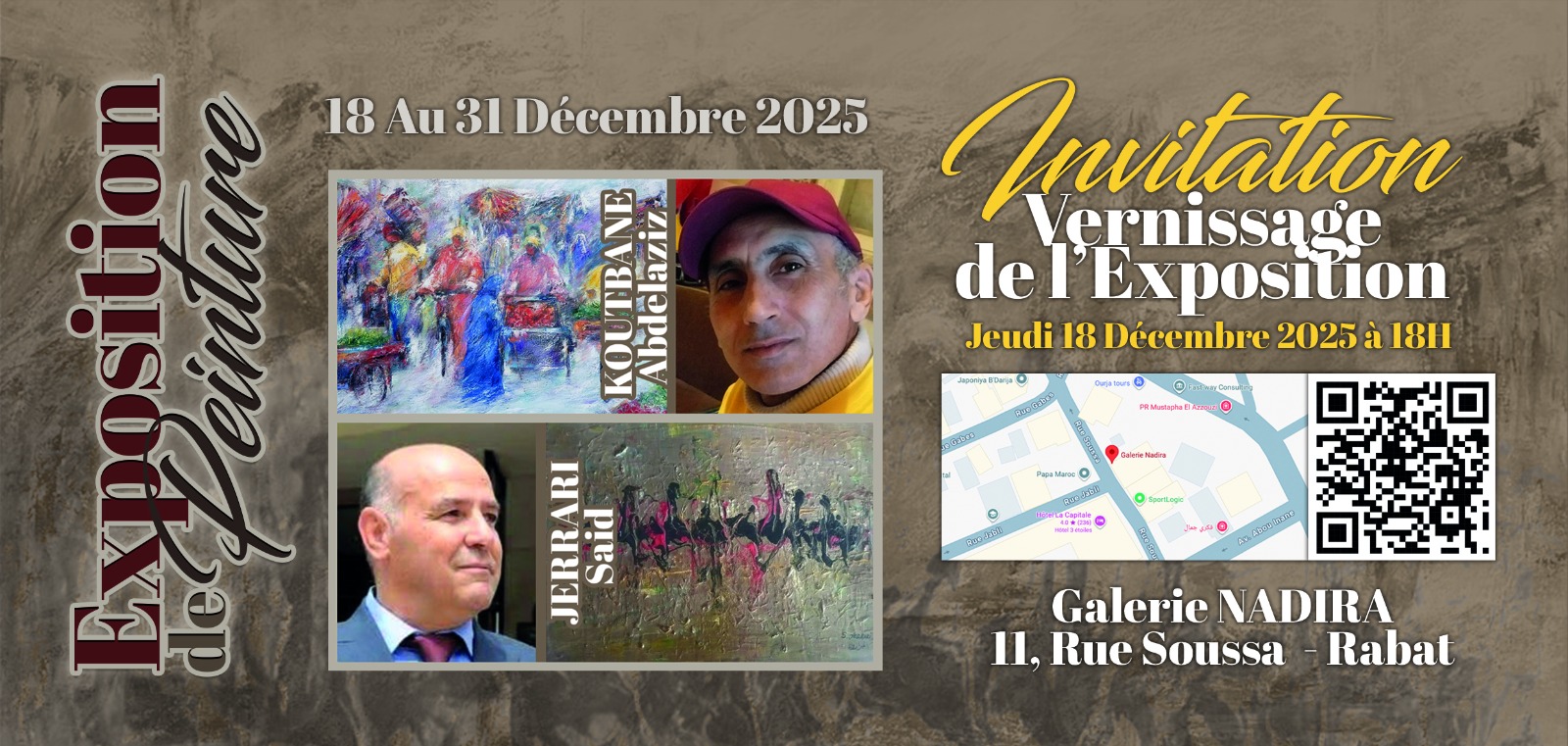 يحتضن رواق نادرة بزنقة سوسة بالرباط معرضا تشكيليا مشتركا، يقدم لعشاق الفنون التشكيلية جديد الفنانين عبد العزيز كوتبان وسعيد جيراري، انطلاقا من يوم الخميس 18 دجنبر 2025، حيث سينطلق حفل الافتتاح في الساعة السادسة مساء، ويستمر المعرض التشكيلي المشترك الى نهاية السنة، يوم 31 دجنبر 2025.
