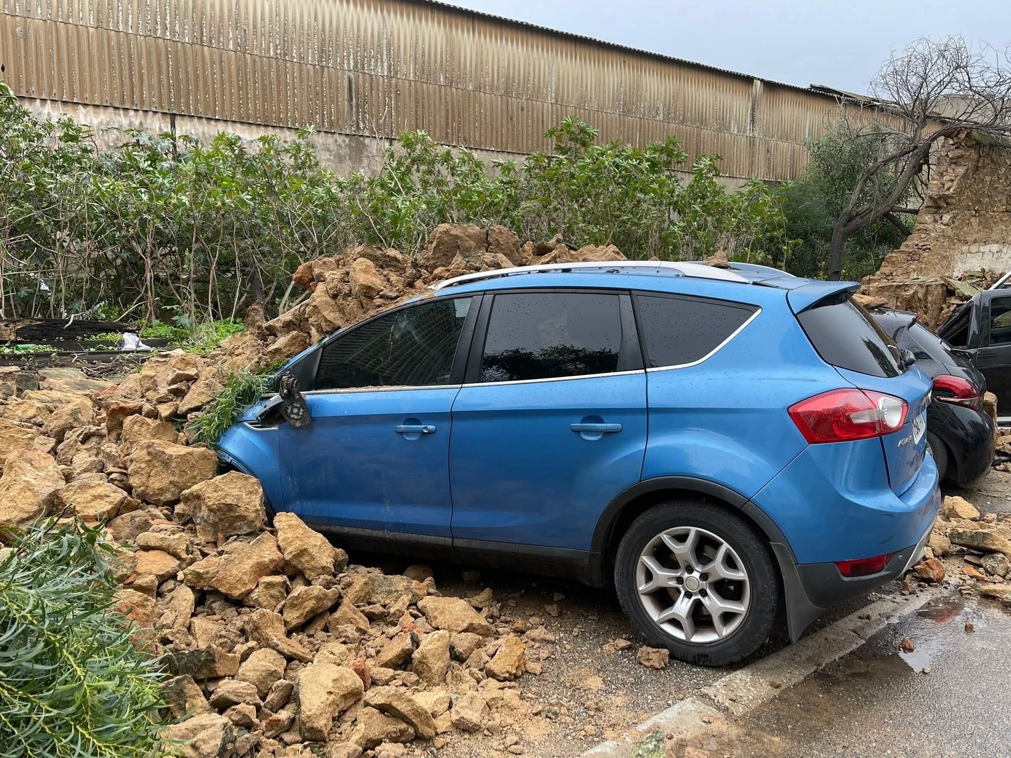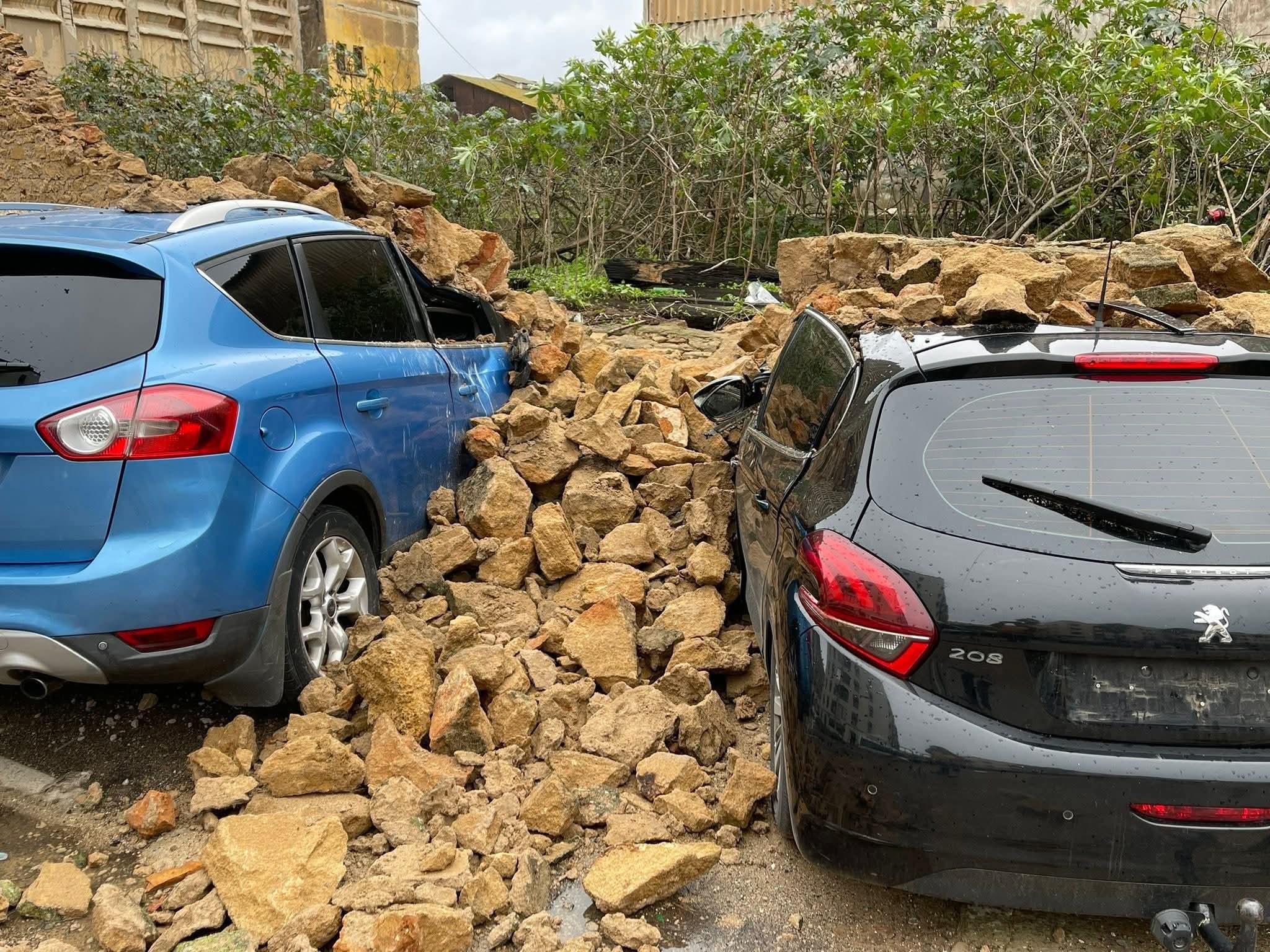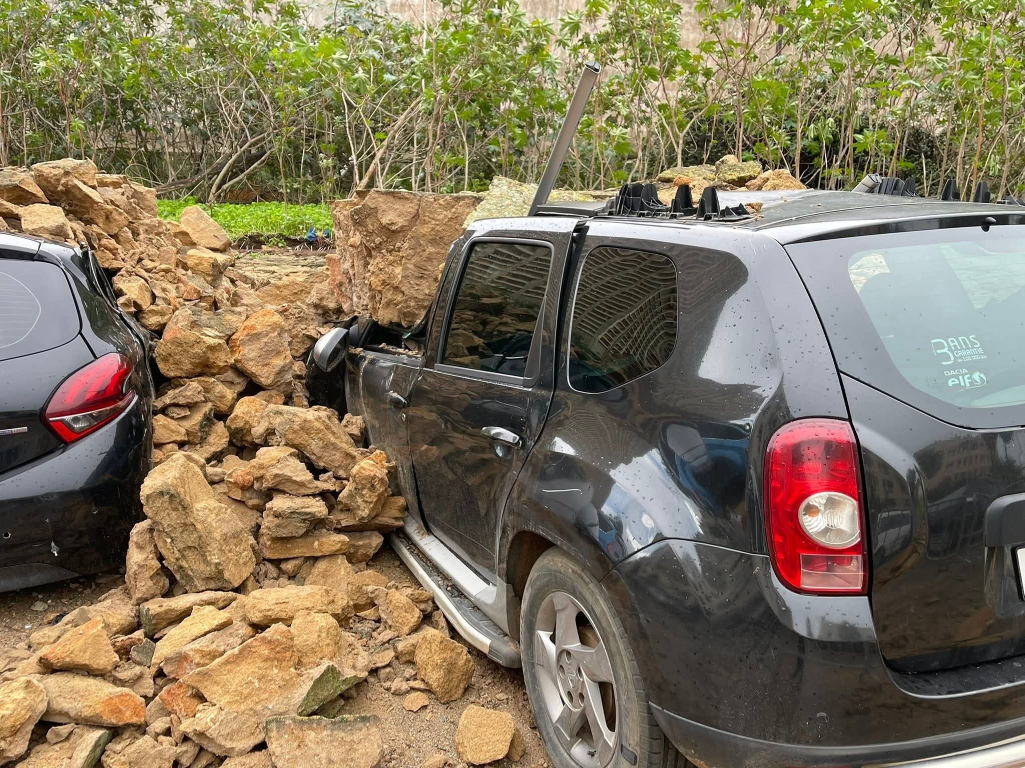 وشملت الأضرار سيارات من طرازات مختلفة حيث بدت غارقة في ركام السور الحجري المنهار.