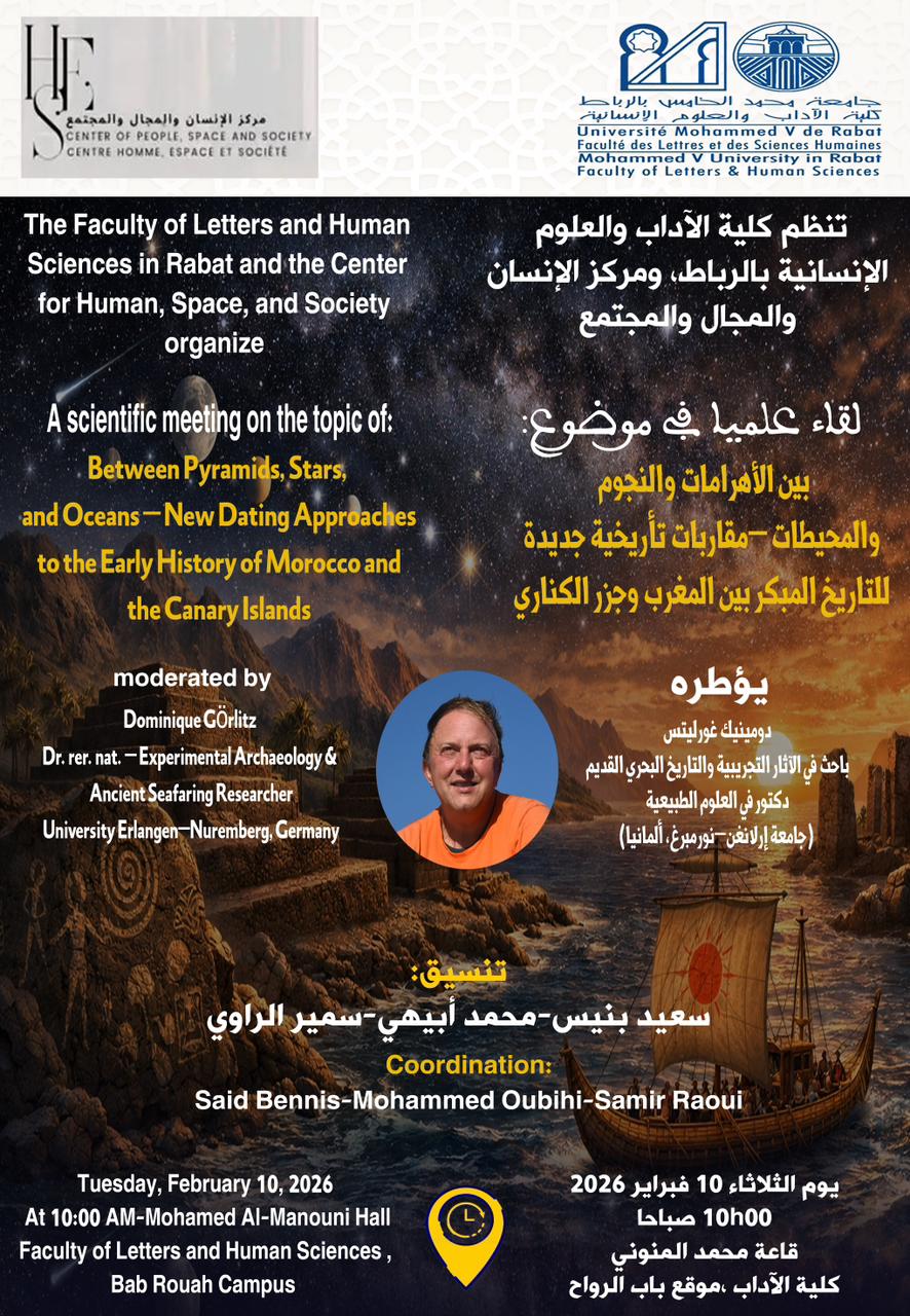 تنظم كلية الآداب والعلوم الإنسانية بالرباط ومركز الأبحاث والدراسات الإنسان والمجال والمجتمع لقاء علميا يوم الثلاثاء 10 فبراير 2026 على الساعة العاشرة صباحا بقاعة محمد المنوني ( كلية الآداب – باب الرواح) تحت عنوان : "بين الأهرامات والنجوم والمحيطات: مقاربات تأريخية جديدة للتاريخ المبكر بين المغرب وجزر الكناري ".